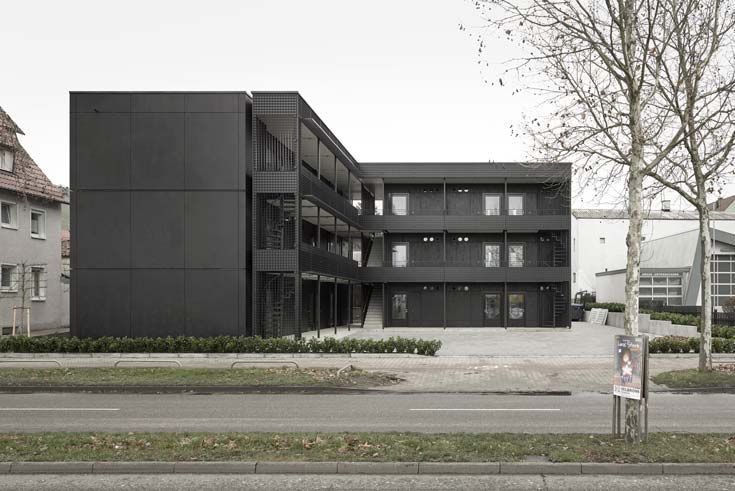 An einer vielbefahrenen Straße am Rande Heilbronns, zwischen Autohäusern, Tankstellen und sanierungsbedürftigen Einfamilienhäusern, befindet sich das Baugrundstück, welches für die Umsetzung dieses Wohnungsbauprojekts gewählt wurde. Über drei Geschosse stapeln sich 23 modulare Mikro-Wohneinheiten in dem L-förmigen Gebäude, dessen schwarze Fassade einen starken Kontrast zur bunten, überladenen Umgebung herstellt. Jede Wohneinheit wird von außen über einen Laubengang erschlossen. Dieser dient zum einen als Verschattung, zum anderen lädt er gerade im Sommer mit seiner Süd-West-Orientierung zur Nutzung als Gemeinschaftsfläche ein.