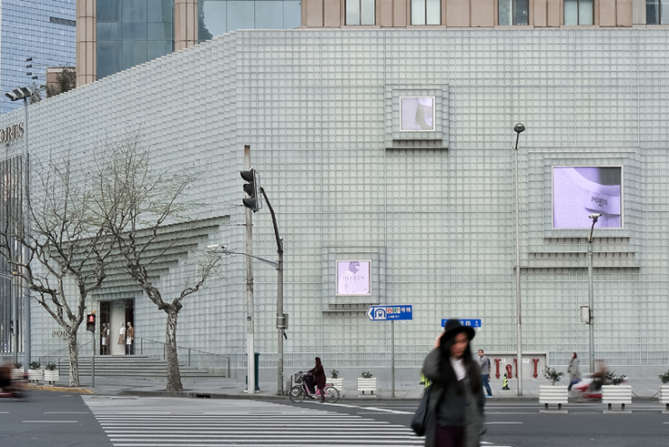 Ein abstrakter Eisblock war die Vision, die dem Entwurf der Architekten zugrunde lag. Tags wirkt er kühl und dämpft die hektische Umgebung, nachts wandelt er sich in einen strahlenden Leuchtkörper. Ein Mauerwerk aus rund 9000 satinierten Glasbausteinen bildet die homogene, transluzente Gebäudehülle, deren Raffinesse in der dreidimensionalen Gestaltung liegt. An der Eingangsfassade sind die Glasbausteine um 45 Grad verdreht und ergeben so ein feines, zickzackförmiges Relief, das im Bereich des Eingangs Reihe um Reihe zurückspringt. Die Schaufensterfläche ist auf zwei verhältnismäßig kleine Öffnungen beschränkt, stattdessen übernehmen großformatige LED-Screens die Werbung. Einige treten plastisch aus der Fassadenebene hervor, andere sind als schmale Längsstreifen in die Zickzackfassade integriert.