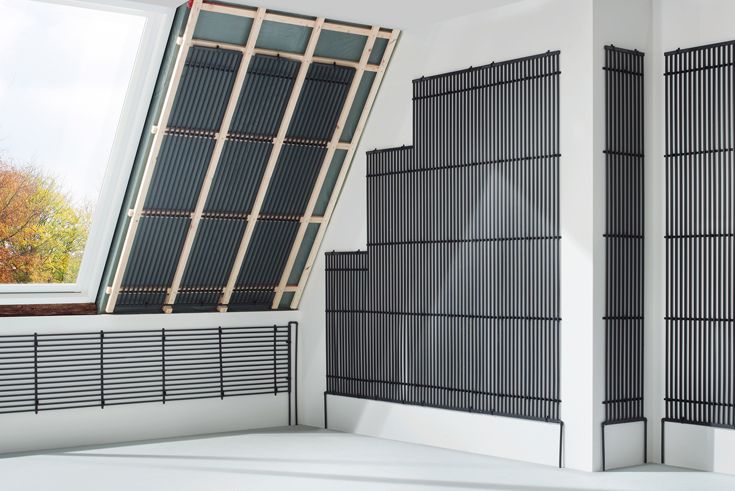 Als Kühldecke im Großraumbüro oder als Wandheizung im Wohnbauprojekt: die Anwendungsmöglichkeiten des Raumklimasystems aquatherm black system sind zahlreich. Die Wirkungsweise besteht darin, dass die Oberflächentemperatur einige Grad unter oder über der Raumtemperatur gefahren wird. Durch Strahlungsaustausch mit der Decke verändern sich die Temperaturen der Raumumschließungsflächen. Die Gesamtleistung wird durch 2/3 Strahlungsanteil und 1/3 Konvektion erzielt. Der verhältnismäßig hohe Strahlungsanteil bewirkt ein angenehmes Raumklima. Durch das subjektiv empfundene Wärmegefühl bei objektiv niedrigeren Raumtemperaturen kann dies auch Energieeinsparungen zur Folge haben. Dabei sind die großen Heizflächen über einen Heizkreis steuerbar.