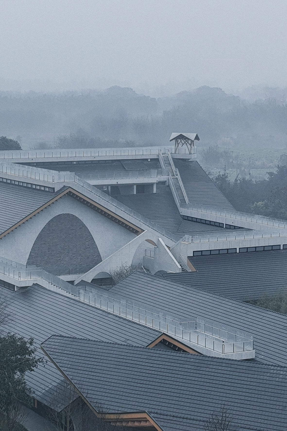 Über den Dachsteg des Anren-Kulturzentrum können Besucher entlang der Dachfirste und Dachrinnen auf und ab wandern, als würden sie zwischen Berggipfeln spazieren gehen. © Schranimage
