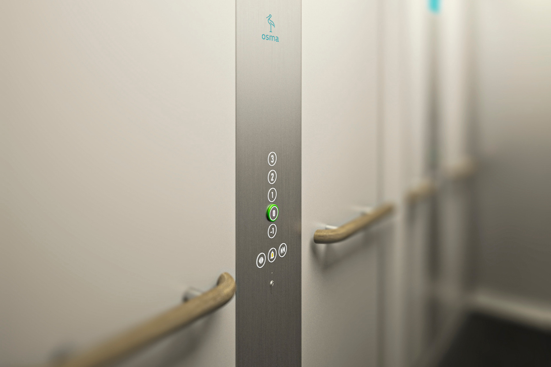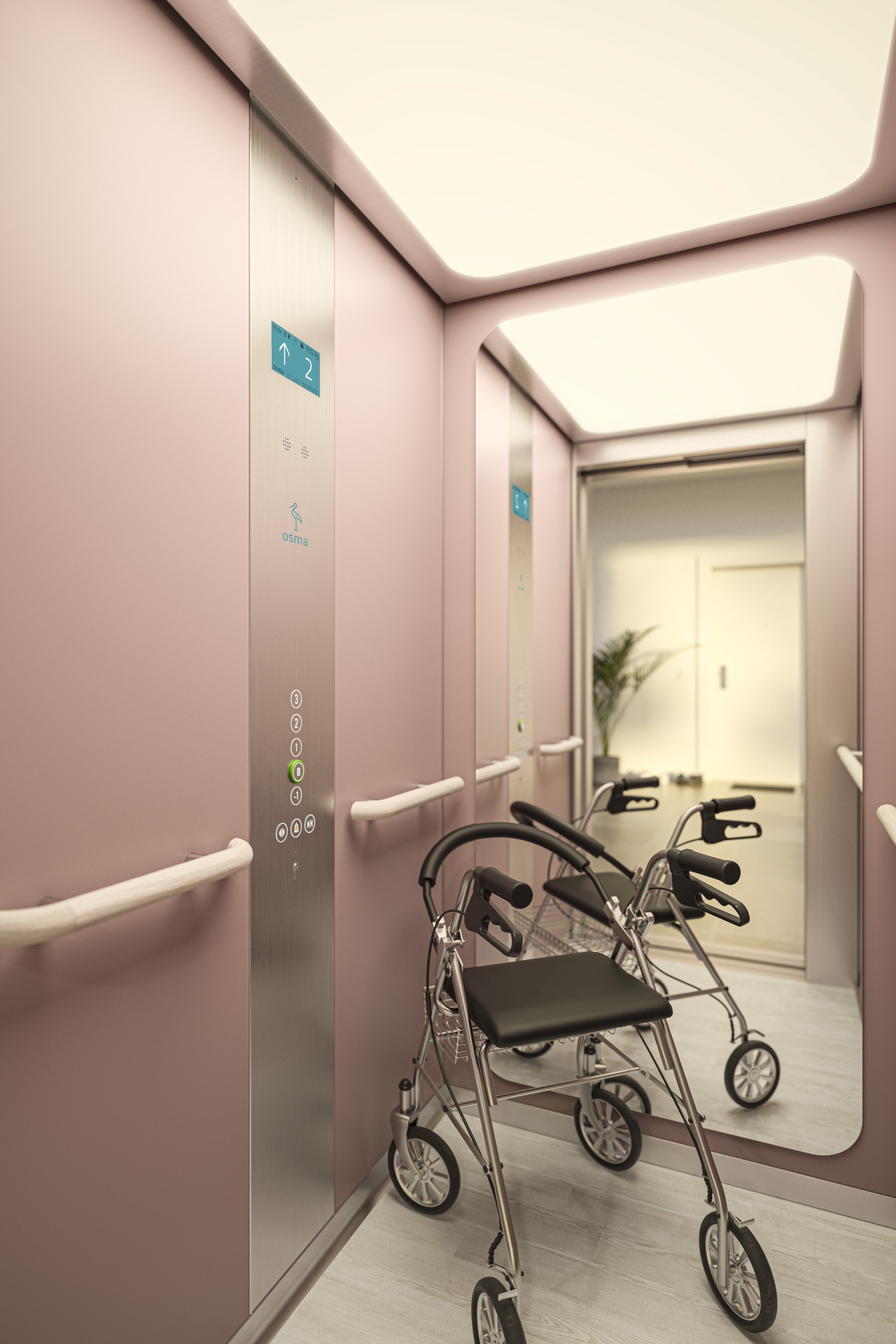 Spiegel, Handläufe und Bedienelemente sind normgerecht angeordnet; Zusatzfunktionen wie Sprachansage oder Einfahrgong sind integrierbar. © Osma