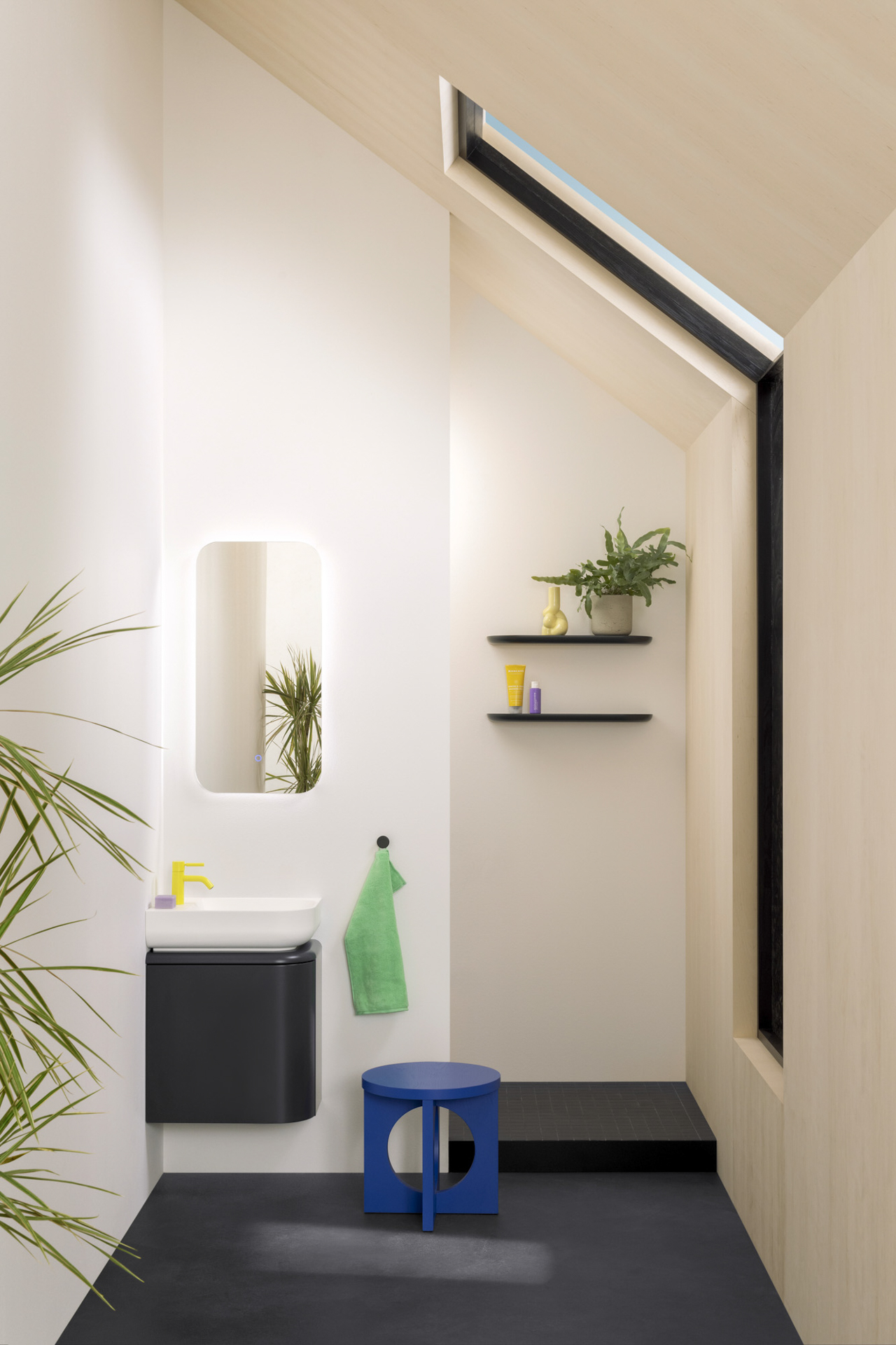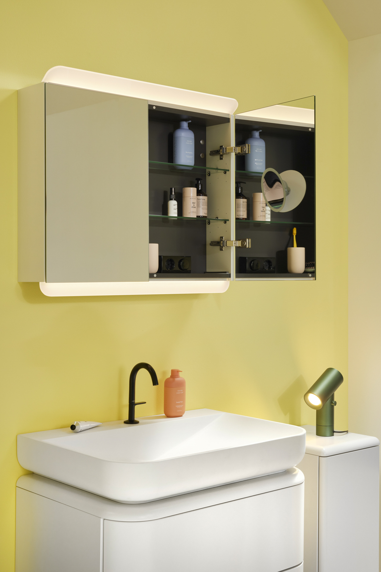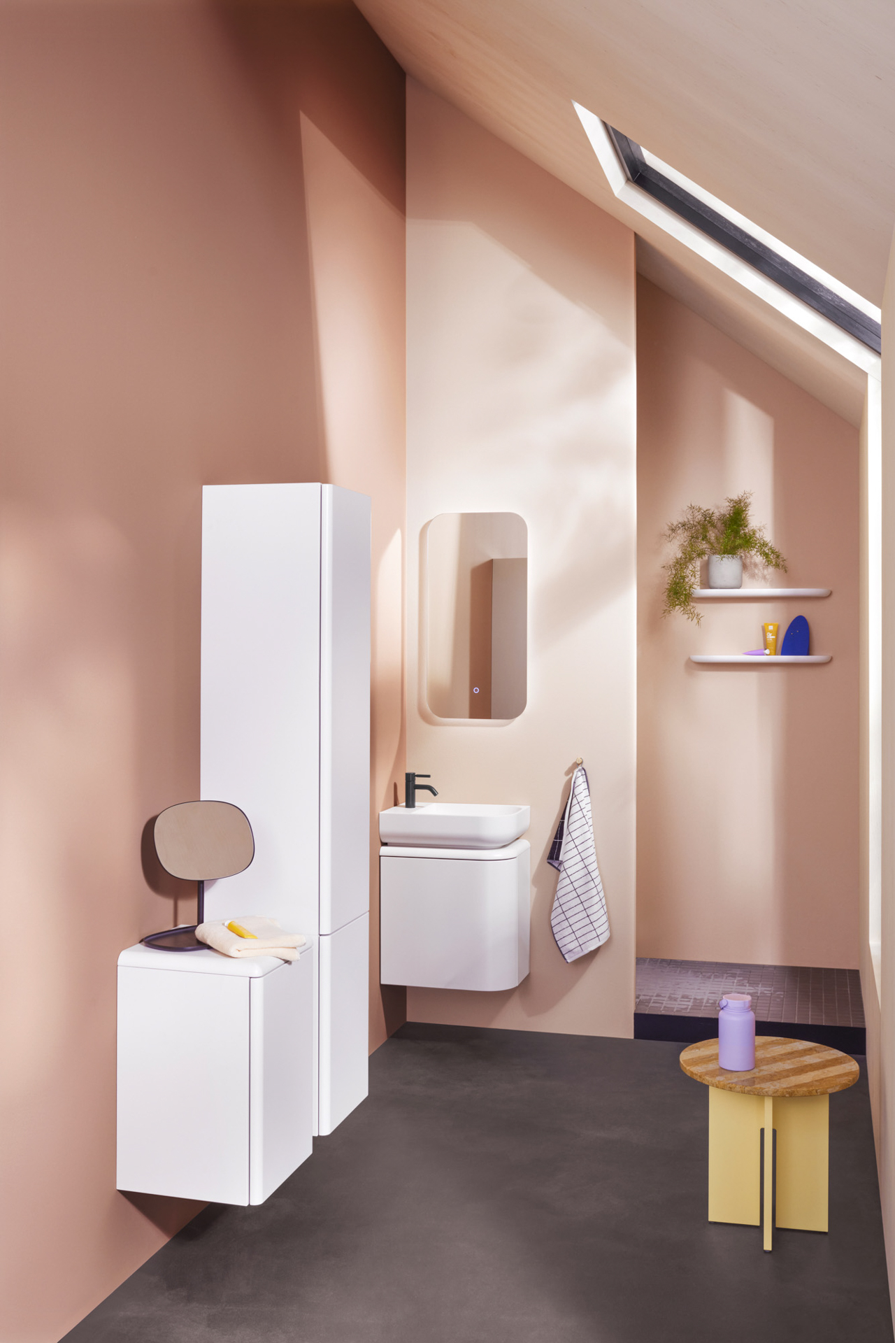 Zur Ergänzung der Eck-Waschtischeinheit stehen kompakte Schränke der Kollektion zur Verfügung. Ein abgerundeter Gästebad-Leuchtspiegel mit durchgängigem LED-Lichtband samt Sensorschalter rundet das Design ab. NG