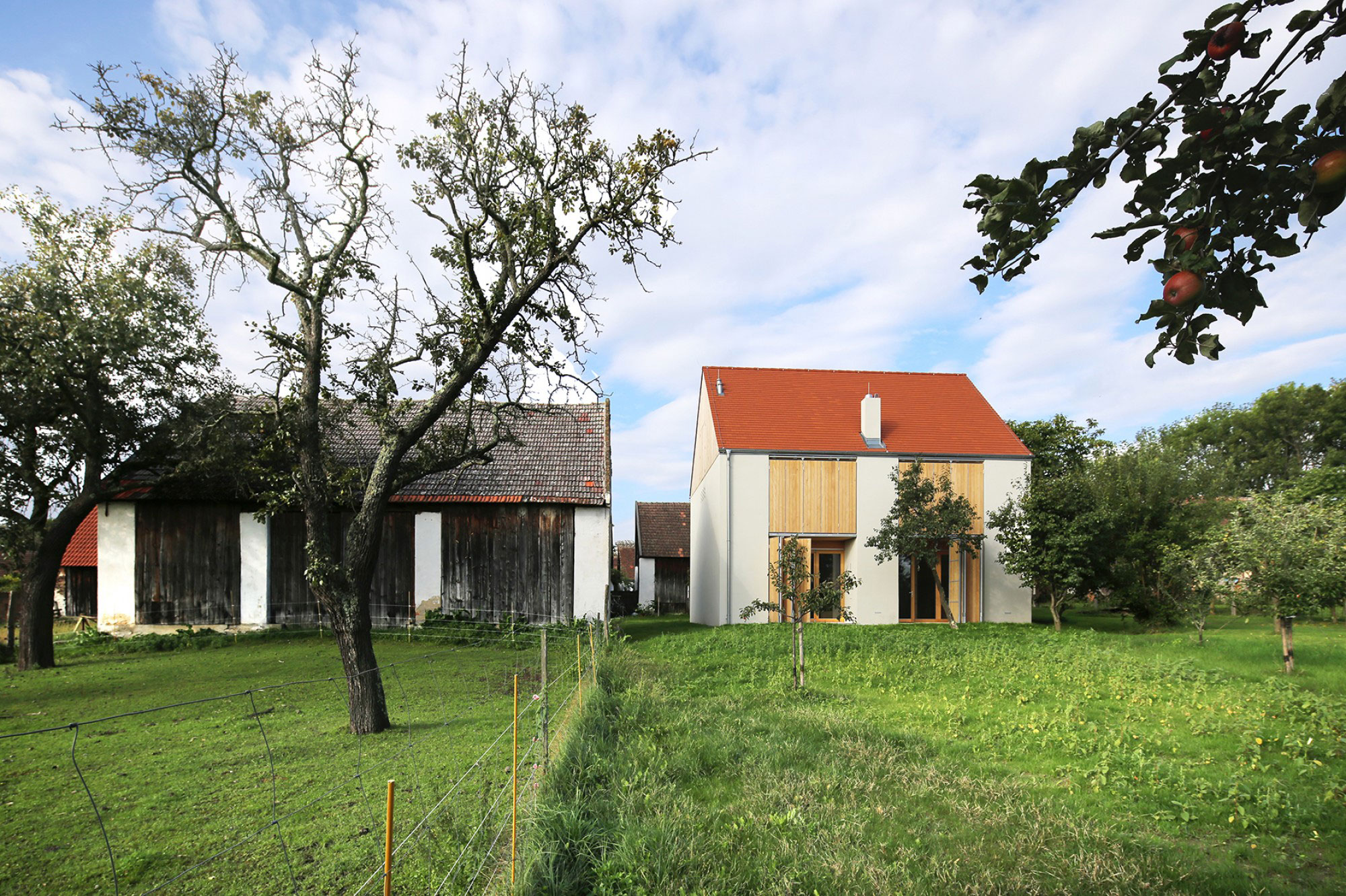 Die anfängliche Idee, den von der Großmutter bewohnten Streckhof für eine gemeinschaftliche Nutzung umzugestalten, wurde schnell verworfen. Weder wollte man einen Qualitätsverlust des typisch südburgenländischen Bestandes durch Umbaumaßnahmen, noch eignete sich die Bausubstanz des existierenden Stadels für einen Ausbau. Stattdessen ergänzt nun ein Neubau den landwirtschaftlichen Bau gartenseitig und orientiert sich in seiner Positionierung an den Nebengebäuden.