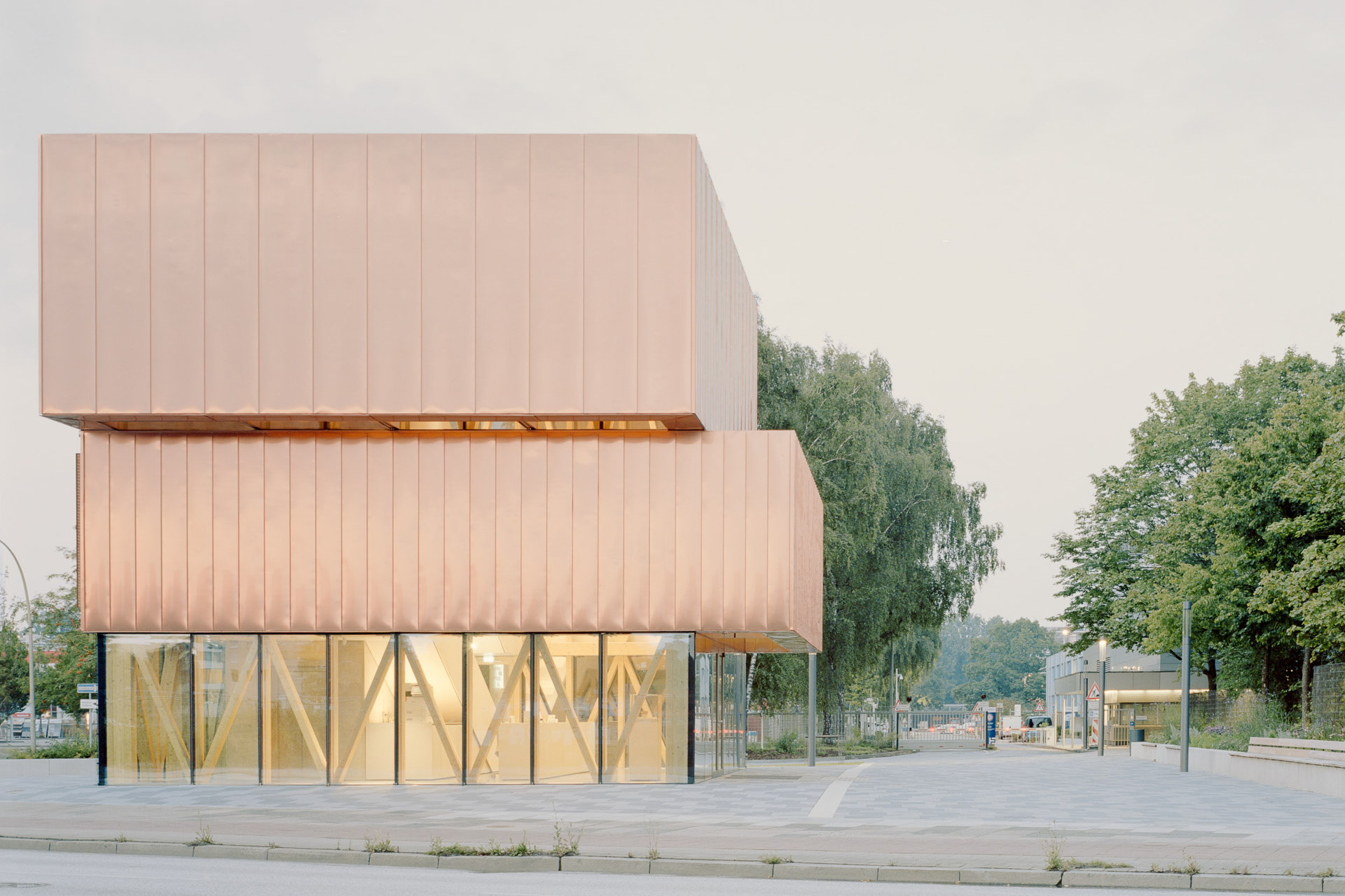 Die Konstruktion basiert auf einem sichtbaren Holzfachwerk, das sowohl das Tragwerk als auch die räumliche Struktur bildet. Es sorgt für eine warme Atmosphäre und macht deutlich, dass Nachhaltigkeit hier nicht nur ein technisches, sondern auch ein gestalterisches Prinzip ist. Während das Erdgeschoss rundum verglast ist, sind die oberen Ebenen mit einer Kupferfassade verkleidet. Die vertikale Gliederung mit Stehfalz und perforierten Elementen erzeugt Tiefe und Plastizität. Tagsüber reflektiert das Kupfer das sich verändernde Licht, nachts erstrahlt der Baukörper von innen und setzt so ein lebendiges Zeichen an der Bramfelder Chaussee.