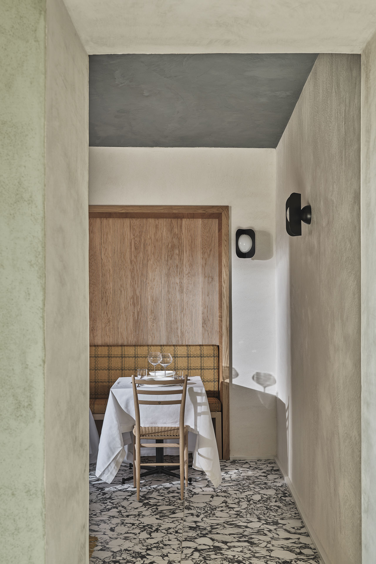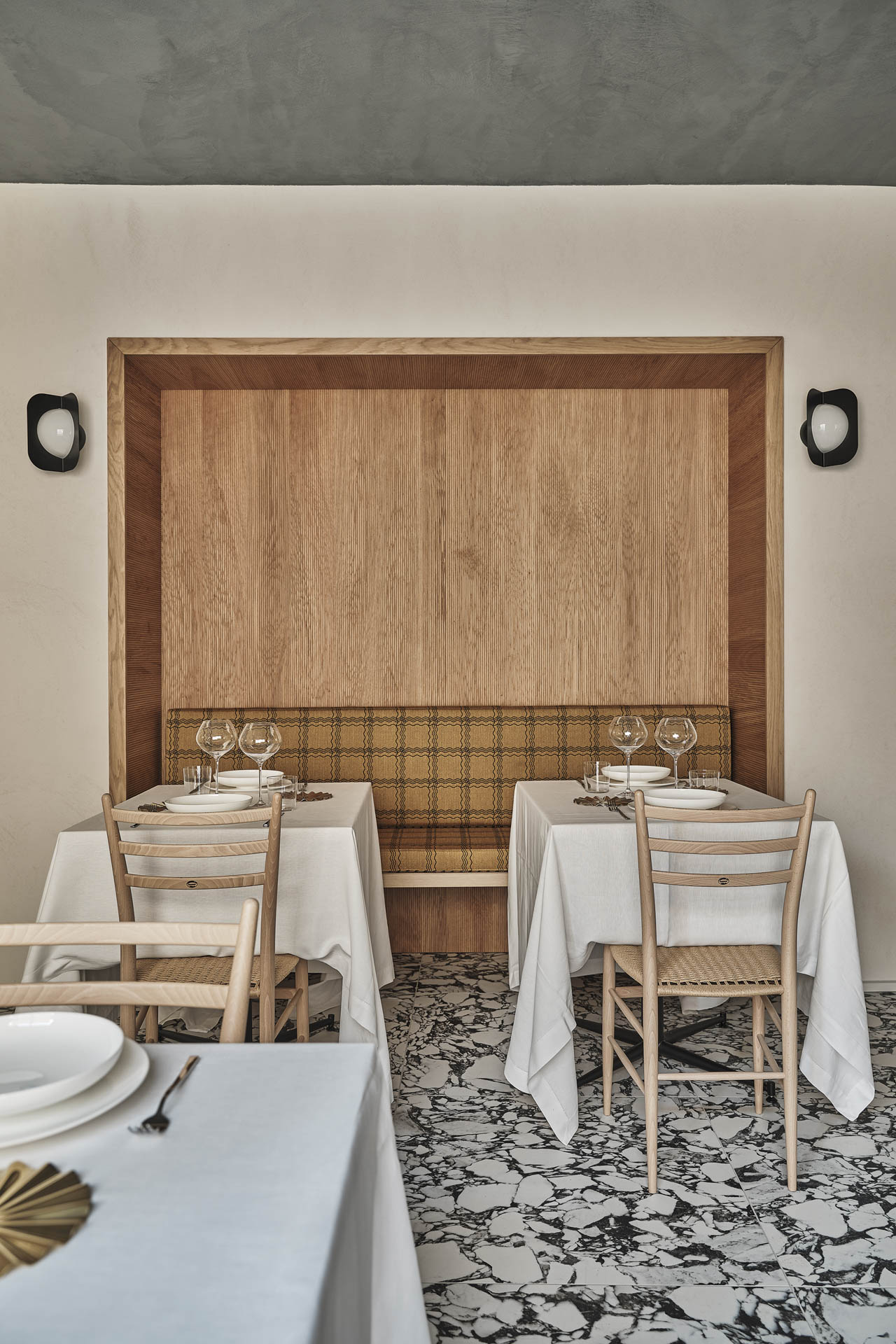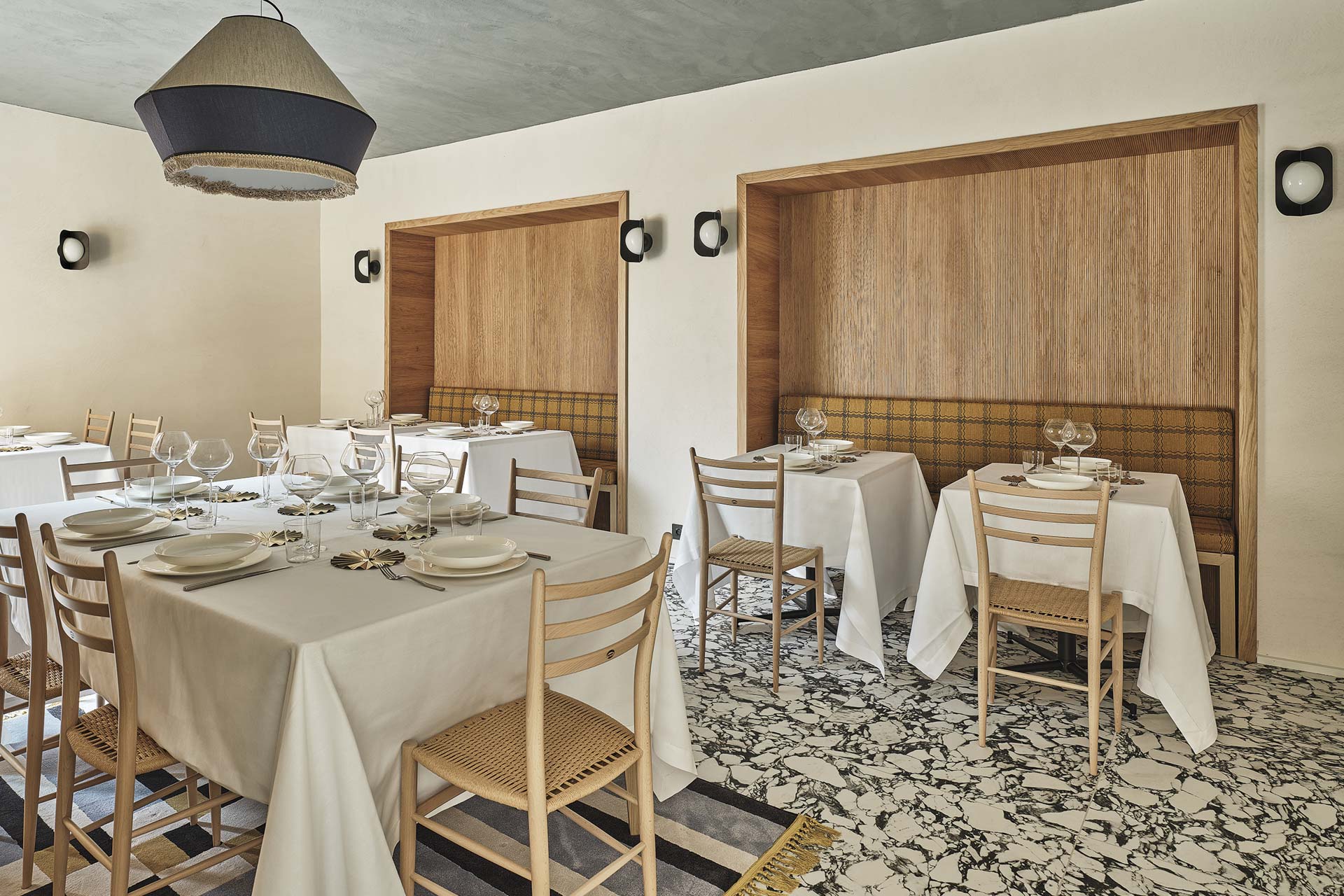 Für die Böden entschieden sich die Planerin für die keramischen Oberflächen von Florim, insbesondere die Feinsteinzeug-Platten aus der Kollektion B&W Marble in der Farbe Pebble. Dies trägt dazu bei, den Wechsel von Schwarz und Weiß in den Räumen zu betonen und das Licht einzufangen, um die Aufmerksamkeit der Gäste auf die Tische zu lenken. Zusätzlich unterstreicht die Florim Kollektion Hi-Wood in der Farbe Almond mit ihrer warmen Holz-Anmutung gezielt die intime und einladende Atmosphäre des Restaurants.