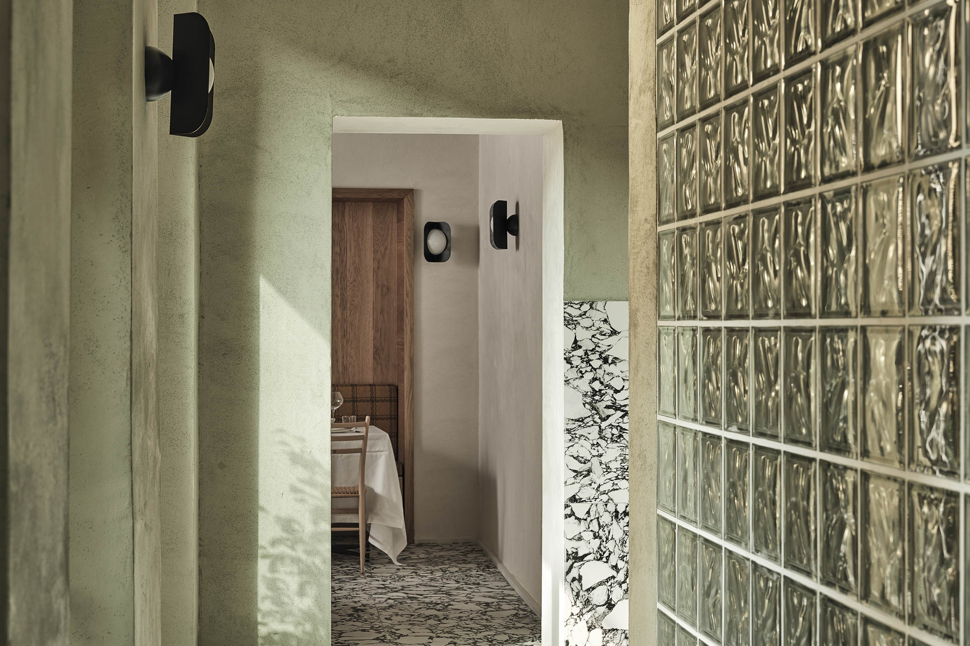 Zudem sollte bewusst mit gängigen Sehgewohnheiten und Erwartungen gebrochen werden. Schon beim Betreten des Restaurants werden die Gäste von Chefkoch Marcello Passoni von einer Vielzahl abwechslungsreicher Farben und Oberflächen begrüßt. Das Entree wird von einem furnierten Holztresen dominiert, der unter einer textilen Deckenleuchte neben einer Schaufensterscheibe mit floralem Muster steht.