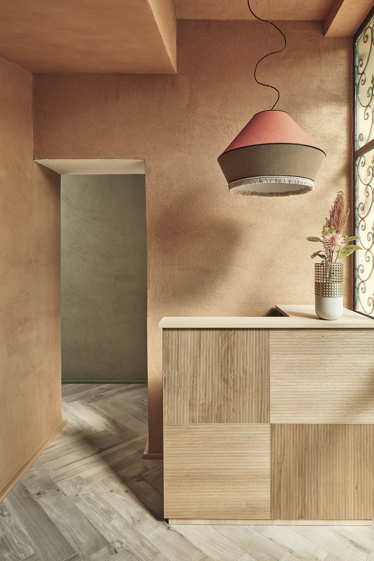 Verputzte Wände in Erdtönen, ergänzt durch Naturmaterialien wie Holz und Stein, prägen das Farbschema der Räume. © Matteo Imbriani