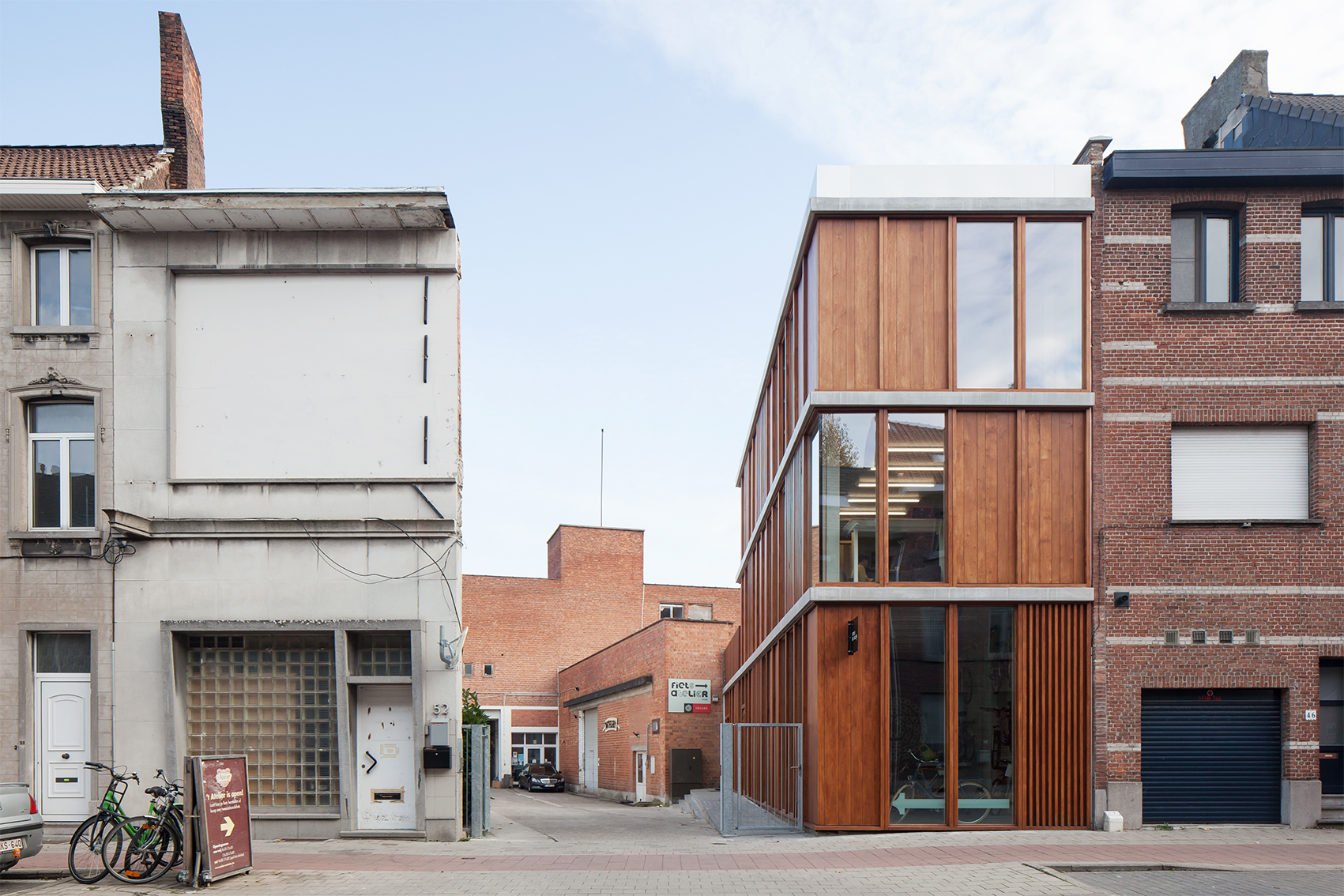 Der dreistöckige Neubau schiebt sich mit einer schmalen Seite an die Straße und bildet an der Längsseite einen Eingangsbereich zu den Werkstätten von ´t Atelier im Hinterhof. Im Erdgeschoss bietet sich nun Raum für ein Gebraucht- und Leihfahrradgeschäft mit einer Reparaturwerkstatt. Eine Etage drüber befinden sich die Büros und im zweiten Obergeschoss sind die Besprechungsräume untergebracht.