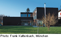 Die ungewöhnliche Gebäudehülle des minimalistischen Einfamilienhauses in Vorarlberg besteht aus einem mattschwarzen Gewebe, das seine Verwendung normalerweise im Gartenbau findet. Unter der Hülle steckt ein hochgedämmter Holzbau, der überwiegend aus vorgefertigten Elementen besteht und den Passivhausstandards gerecht wird. Für die Heizung der Wohnräume genügen die meiste Zeit des Jahres ein kontrolliertes Belüftungssystem mit hocheffizienter Wärmerückgewinnung und ein Erdkolektor; über eine Phtovoltaikanlage auf dem Dach wird Strom erzeugt.