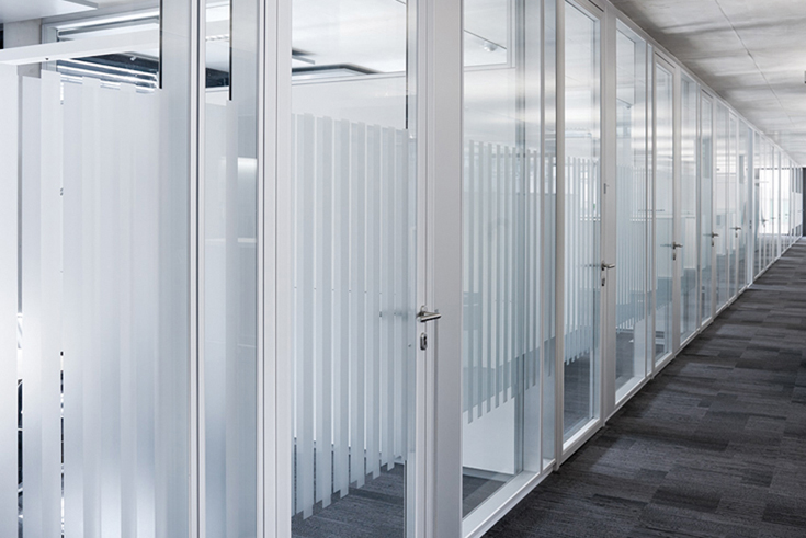 Für den Neubau des Microsoft Headquarters in München entwickelte Feco das flurseitig flächenbündige Alurahmen-Glas-Türelement »A75«. Feco realisiert damit den Wunsch des Auftraggebers, die wandbündige Doppelverglasung »fecofix« mit einem Glas-Türelement der Schallschutzklasse 3 zu ergänzen, bei dem das Glas-Türblatt in der Ebene der Verglasung der Flurwand liegt. Das Ergebnis ist eine durchgehende Transparenz und ein erhöhter Schallschutz.