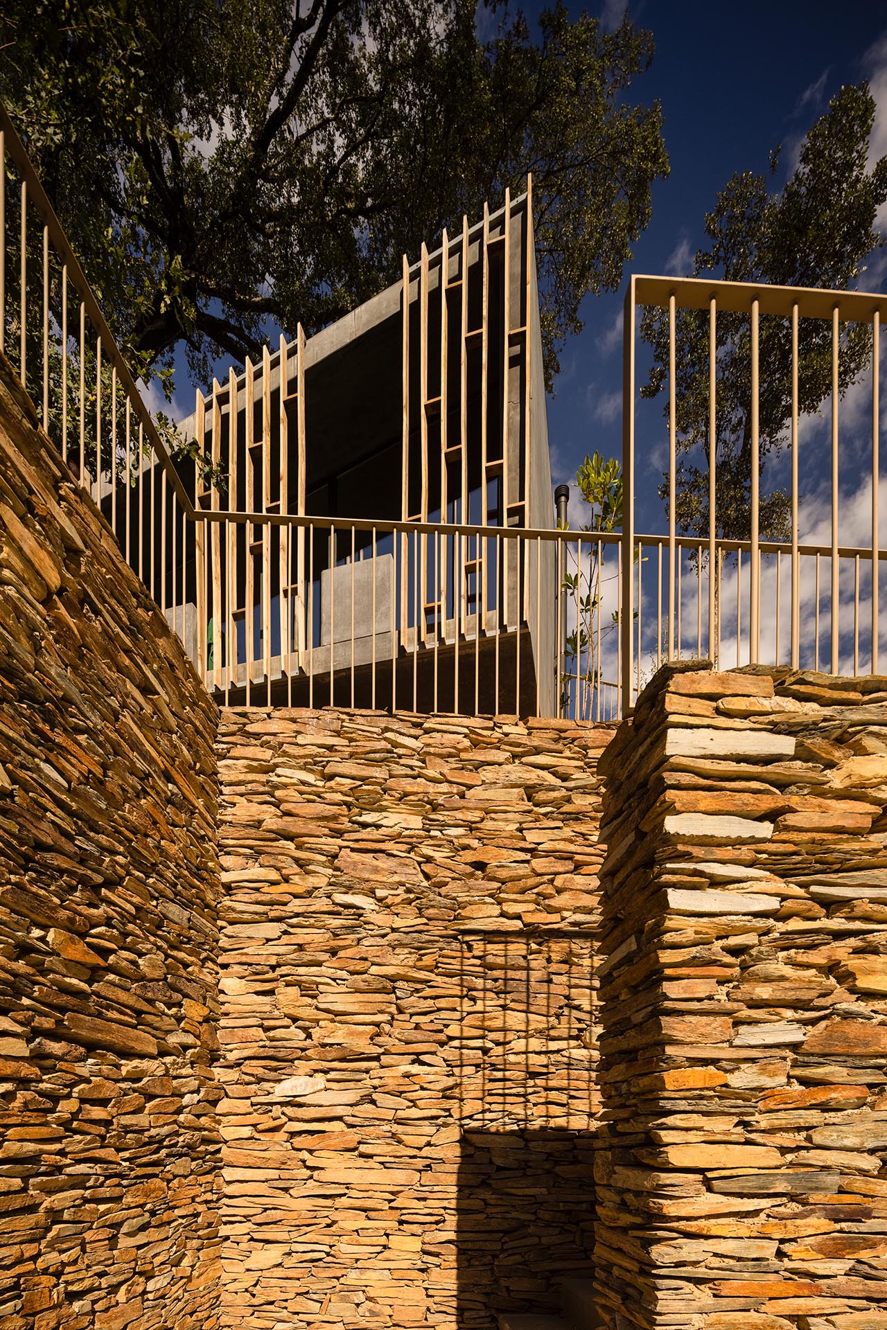 Vorgeblendete Holzgitter schützen vor Sonne und bewahren vor zu viel Einblick. © Fernando Guerra_FG+SG