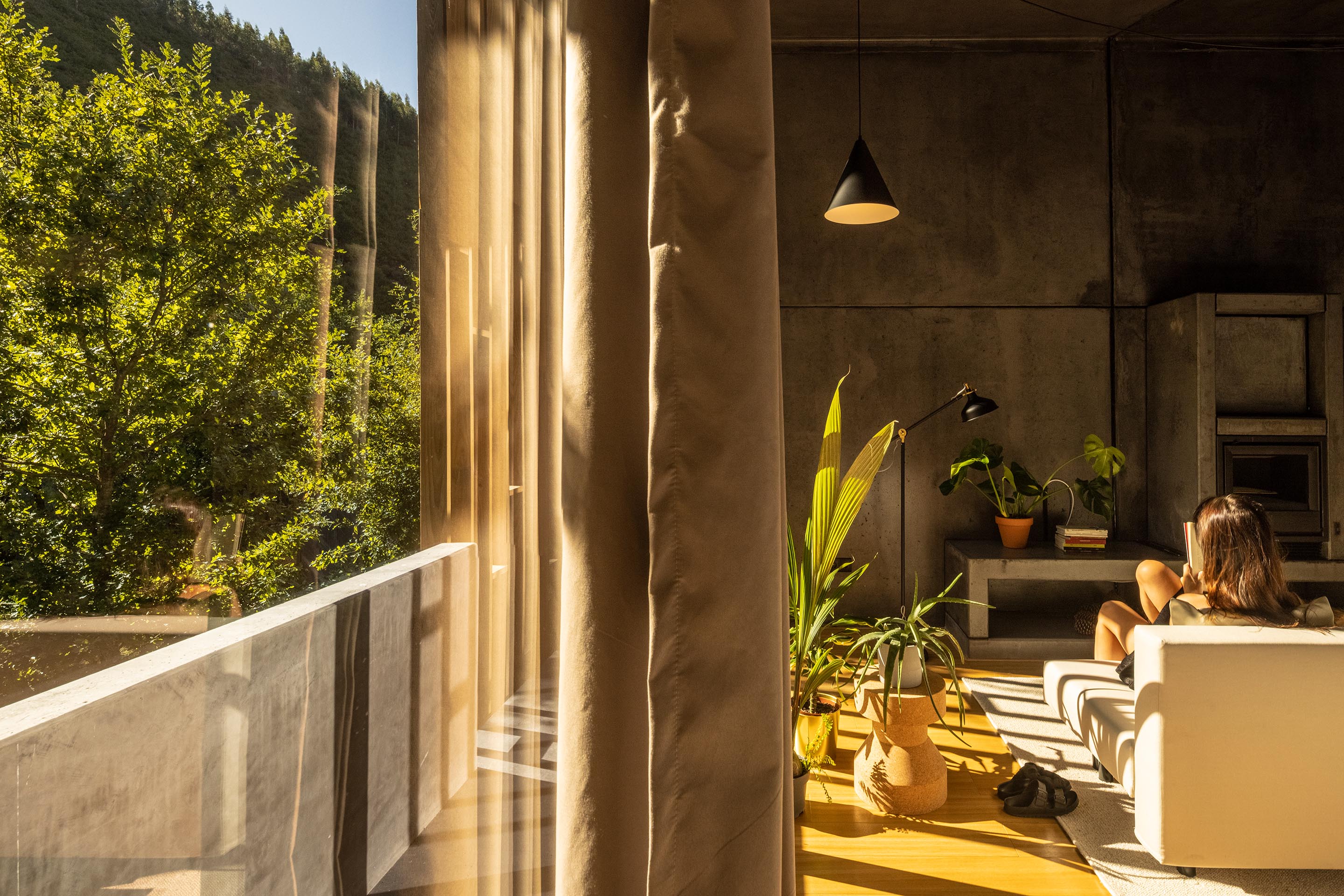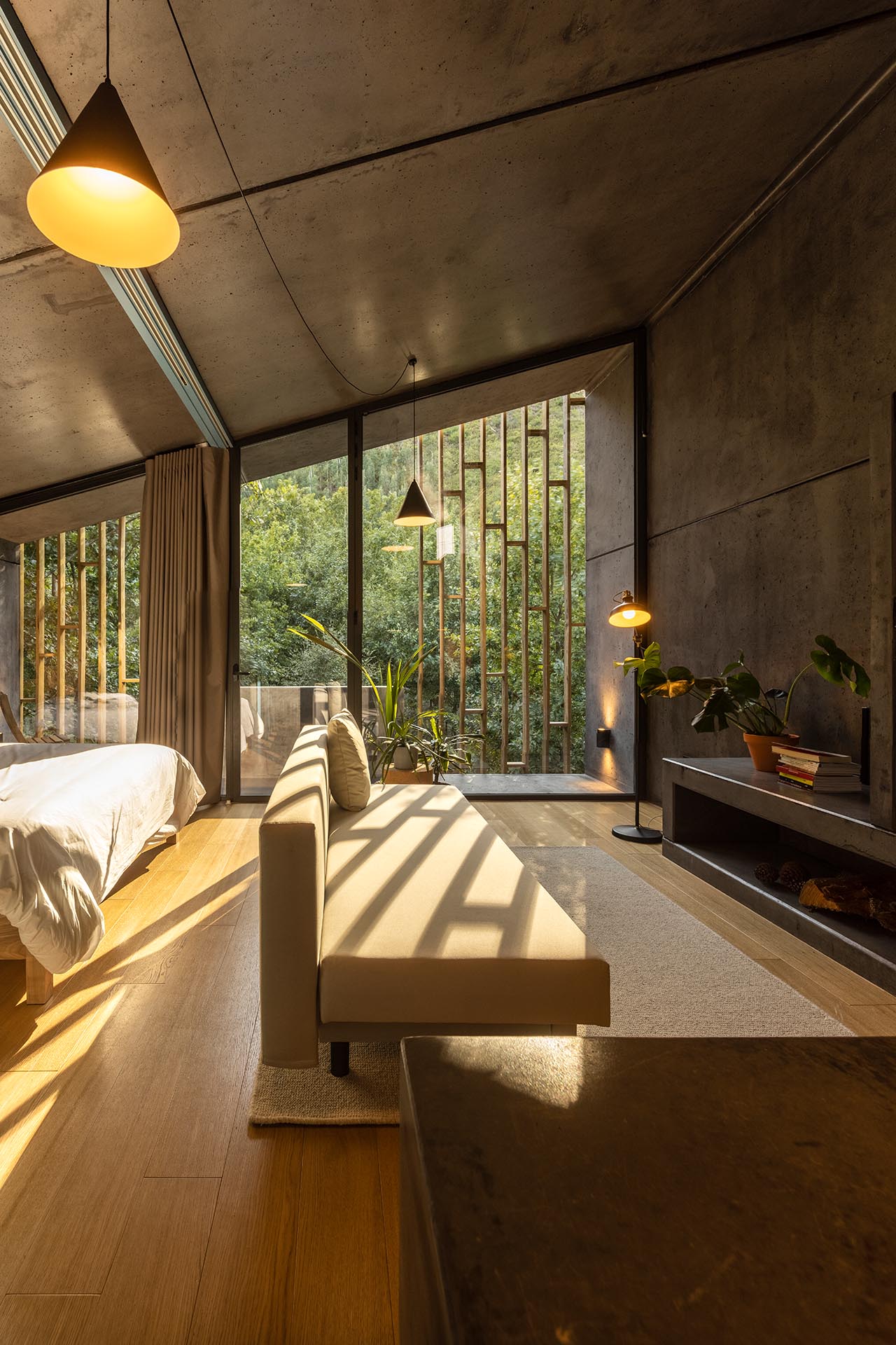 Die Anlage entwickelt sich von der höher gelegenen Straße aus hinunter Richtung Fluss. Von oben ist zunächst nur der Parkplatz sichtbar – das Rezeptionsgebäude ist in den Hang gebaut. Die elf Ferienhäuser sprenkeln die Landschaft und warten mit vier unterschiedlichen Größen auf. Je nach Grundrisstyp können in den Bauten zwei bis sechs Personen unterkommen. Zum Fluss hin kragen die Bauten mit ihren Loggien leicht über die Stufen im Gelände aus. Ein vorgeblendetes Holzgitter schützt vor der Sonne und bewahrt die Gäste vor zu viel Einblick.
