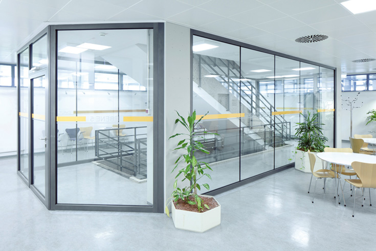 Mit »Contraflam Structure EI 30« lassen sich moderne Ganzglaslösungen mit sehr guten Schalldämmwerten realisieren. Durch eine spezielle Konstruktion mit filigranen, vertikal angeordneten Silikonfugen kann auf senkrechte Rahmenprofile verzichtet werden.