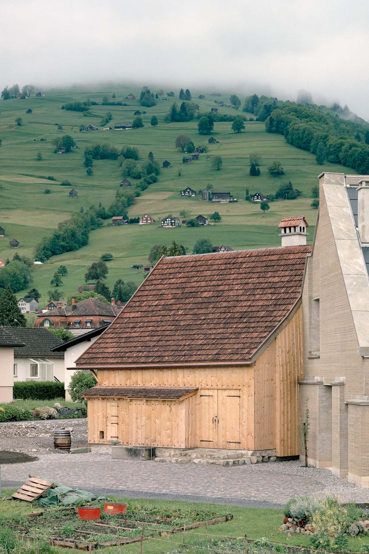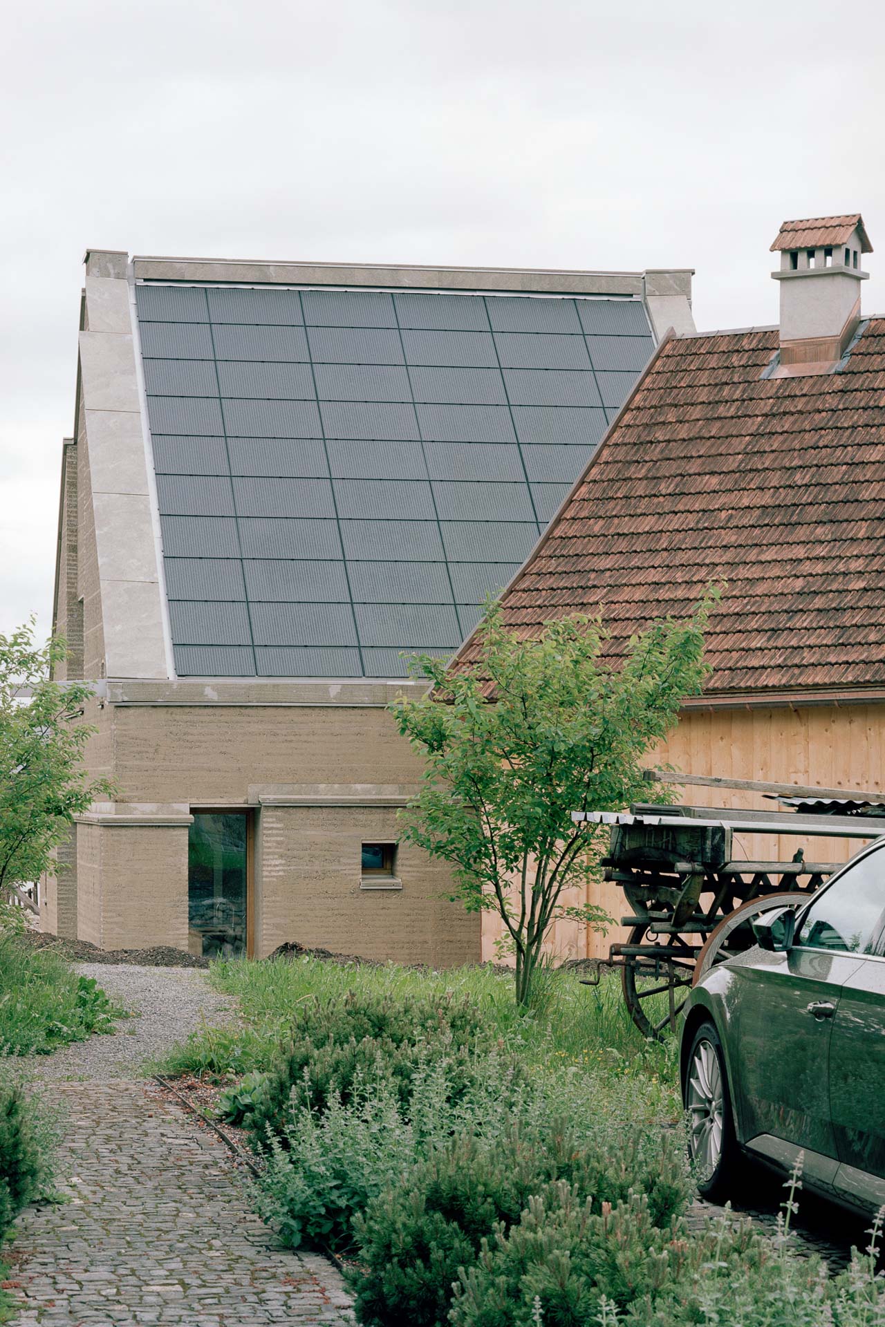 Für eine zeitgemäße Nutzung mit Küche, Toiletten und beheiztem Studio ergänzen sie das Gässli um einen Neubau aus vorgefertigten Stampflehmelementen. Allen + Crippa setzten ihn über Eck an die Nordfassade des historischen Strickbaus. Er besteht aus etwa 200 Lehmelemente, bis zu 85 cm stark, die eine Firma aus Vorarlberg herstellte. Schwer und massiv steht der Neubau neben dem filigranen Gefüge des Strickbaus. Die sichtbaren Schichten des Stampflehms aber greifen die Stapelstruktur der historischen Blockwände auf und schaffen einen Dialog zwischen Alt und Neu. Versätze in der Fassade betonen das Gewicht des Materials. Stürze und Ringanker aus Stahlbeton stabilisieren die Stampflehmfassade. Das Dach ist vollflächig mit Solarpaneelen belegt, gefasst von Natursteinplatten and Traufe und Ortgang.