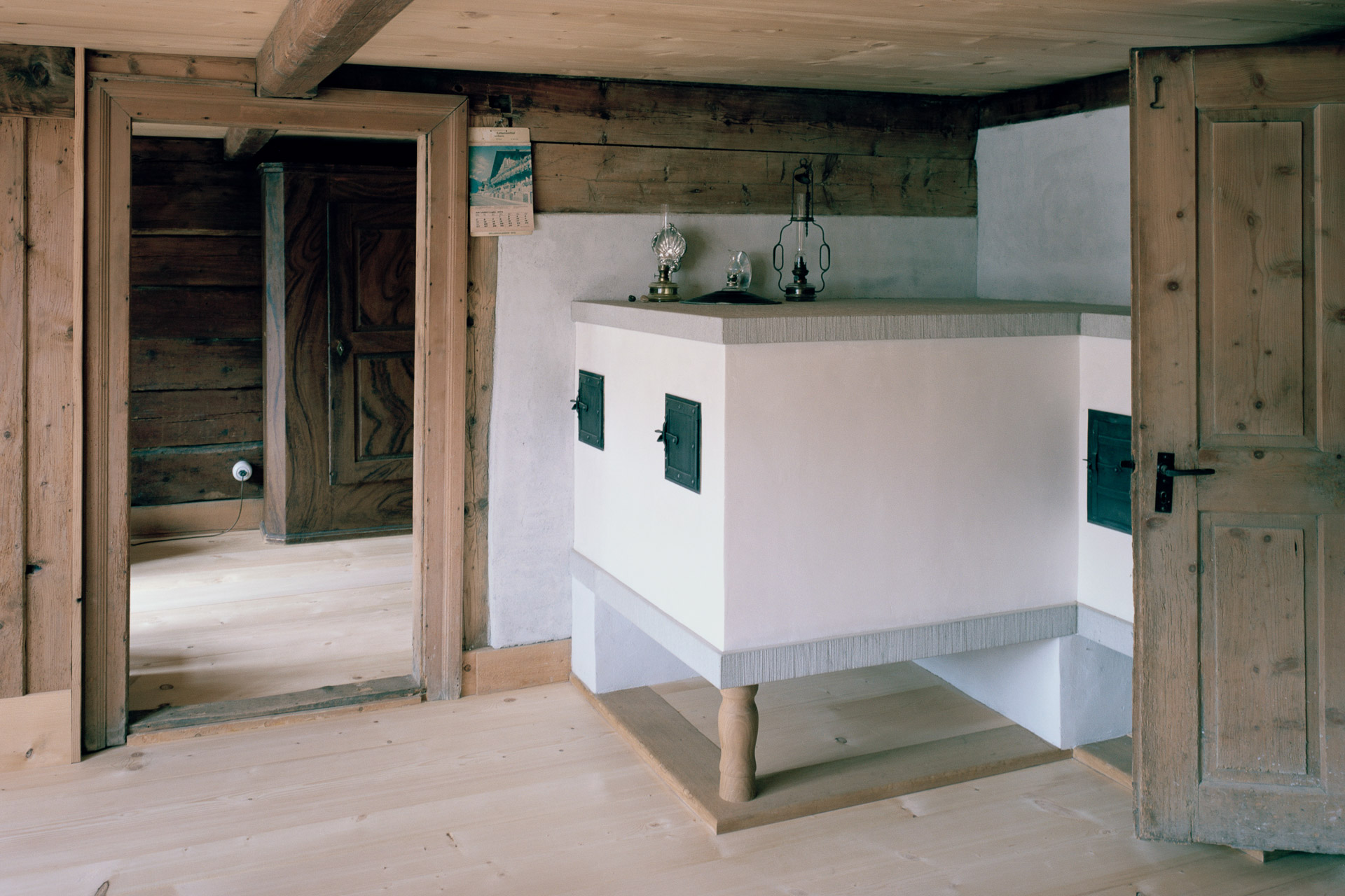 Der traditionelle Ofen im Strickbau wurde neu errichtet. Er heizt Stube und Nebenstube. Die Räume sind nur 1,80 m hoch. © Rory Gardiner