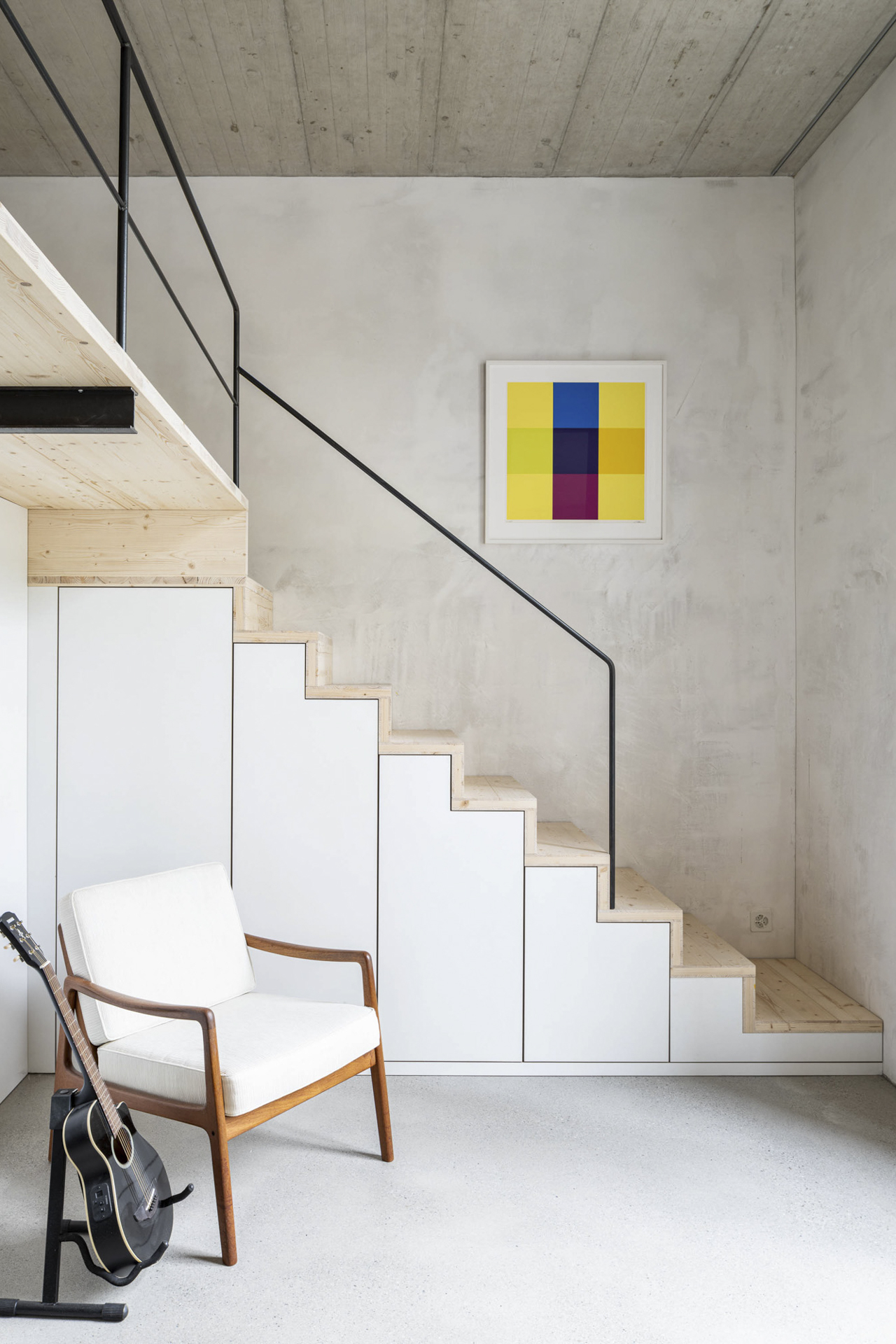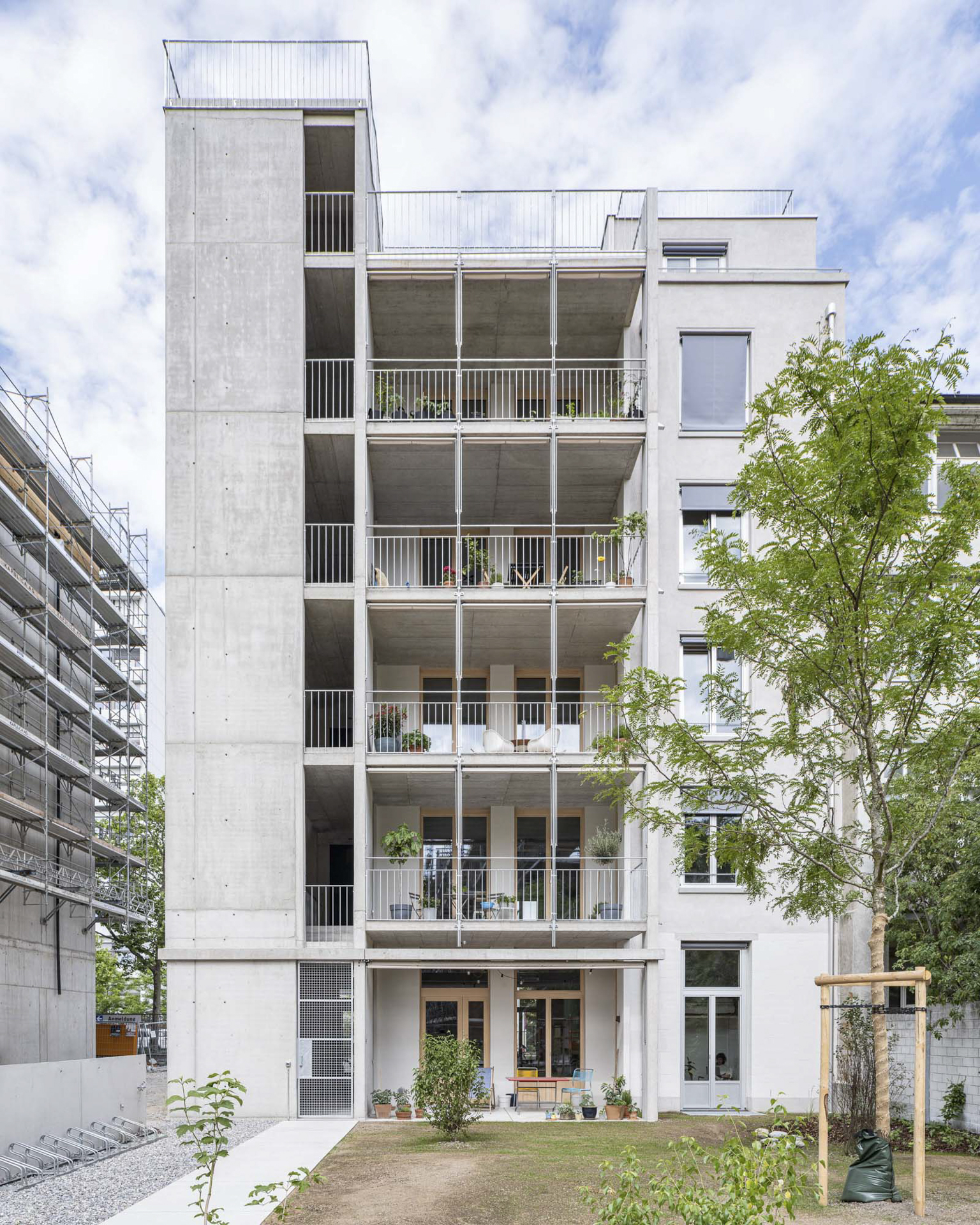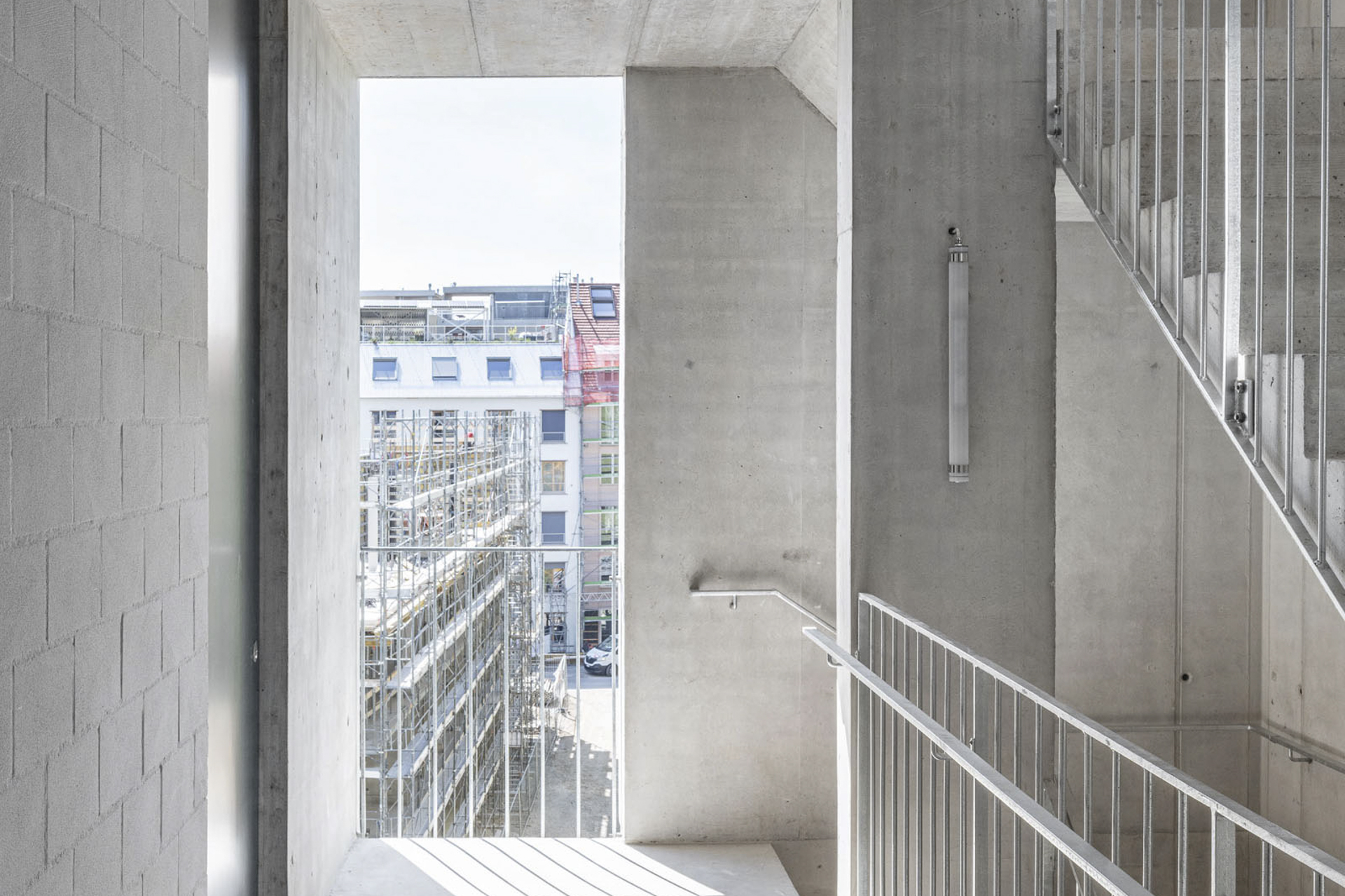 Das Treppenhaus befindet sich exponiert an der hofseitigen Ecke des Genossenschaftsbaus. Als offener Begegnungs- und Erschließungsraum bildet es das zentrale, gemeinschaftliche Element. Die Betonskulptur verbindet alle Wohnungen und Balkone mit dem Garten und der Dachterrasse.
