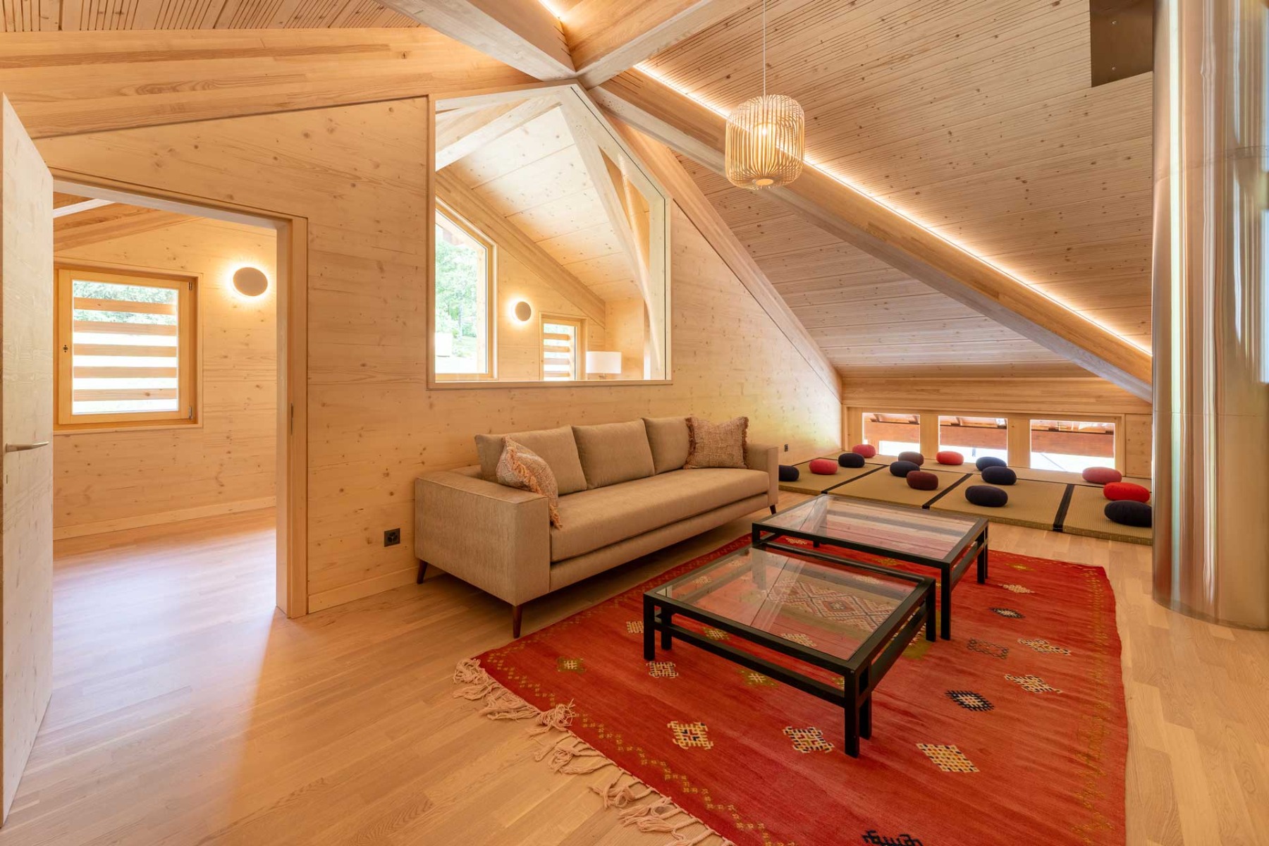 Für die statische Struktur und den Innenausbau kamen natürliche Materialien zum Einsatz. Die sichtbaren Holzdecken aus Lignatur-Elementen mit Akustik Typ 9.1 gewährleisten nicht nur die Tragfähigkeit, sondern ermöglichen auch eine optimale Raumakustik. Integrierte Schwingungstilger vom Typ silence12 tragen ausserdem zu einem hervorragenden Schallschutz bei. Das Raumangebot wird durch zwei Gästezimmer im Dachgeschoss und eine separate Ferienwohnung im Erdgeschoss ergänzt – mit eigener Sauna, Wohnzimmer, Bad, Küche und überdachter Terrasse. Diese baulichen Ergänzungen wurden ebenfalls in Holzbauweise umgesetzt und fügen sich nahtlos in das Gesamtkonzept ein.