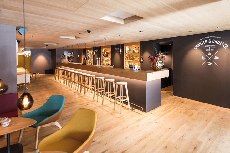 Die moderne Komponente wird durch die Retromöbel des deutschen Herstellers »Zeitraum« abgedeckt. Auf dem Boden der Bar wurde »Trendpark Eiche 35« verlegt. Das gebürstete Parkett hat eine Deckschicht aus naturgeölter Eiche. Die »35« bedeutet eine stärkere Maserung des Holzes. Damit wird der natürliche, alpine Charakter nochmals unterstrichen.