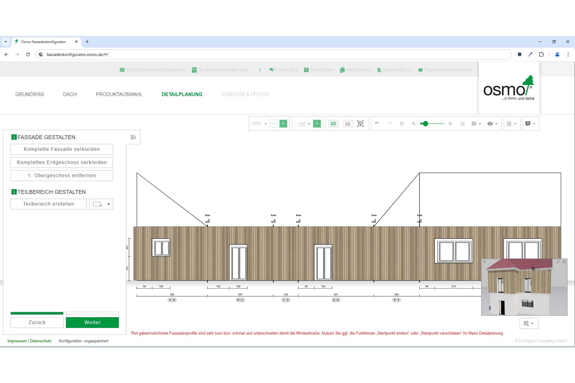 Der Osmo Fassadenkonfigurator ist der einzige Konfigurator am Markt, der zum einen eine Fassade fachlich korrekt und mit absoluter Präzision konstruiert und dem Anwender zum anderen auch noch eine komplette Materialliste mit allen notwendigen Produkten und Zubehörteilen an die Hand gibt. © Osmo