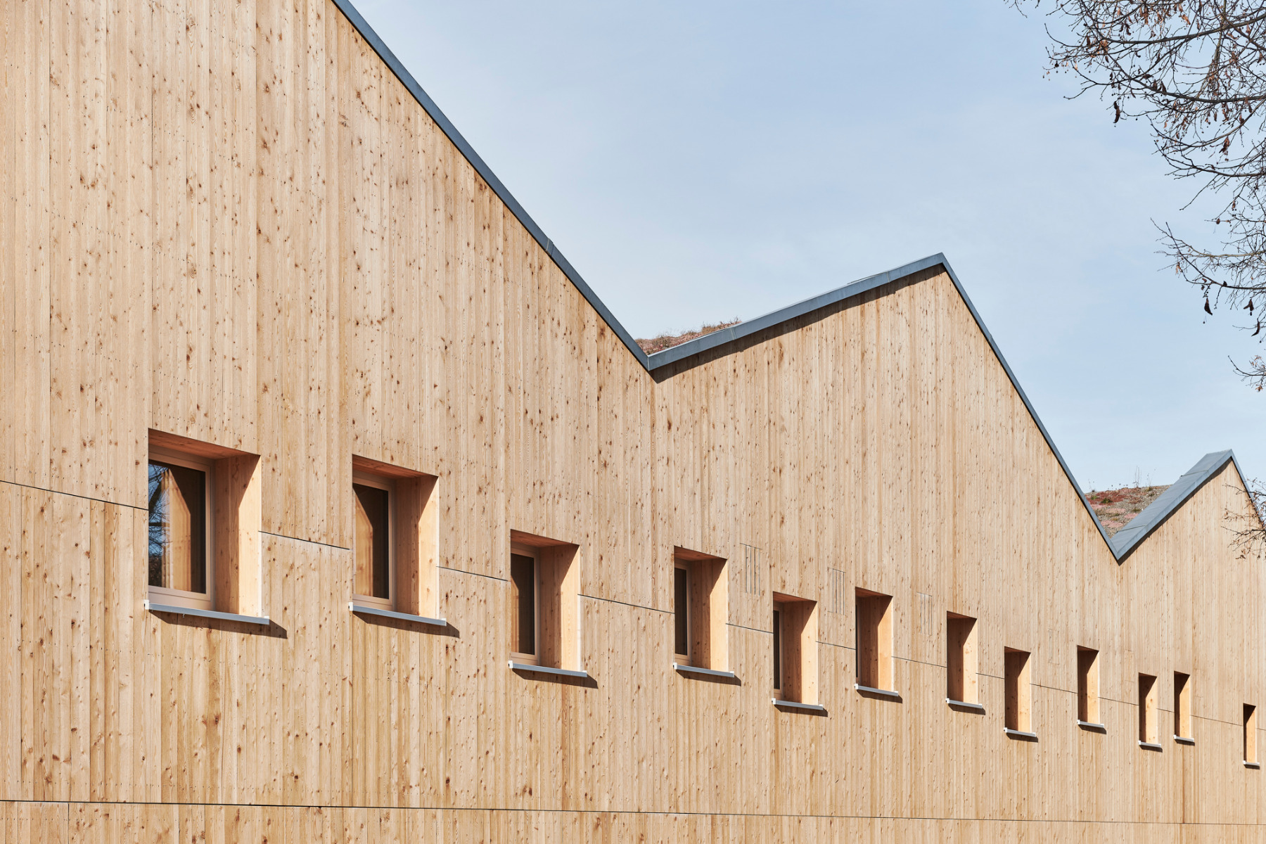 Dem Aspekt der Nachhaltigkeit wurde mit einer Holzrahmenbauweise genüge getan. Die Verwendung von nachwachsenden Rohstoffen zeigt sich ebenfalls in der unbehandelten, naturbelassenen Lärchenschalung der Fassade. Durch gleichmäßiges Vergrauen wird der Veränderungsprozess des natürlichen Materials für die Kinder erlebbar.