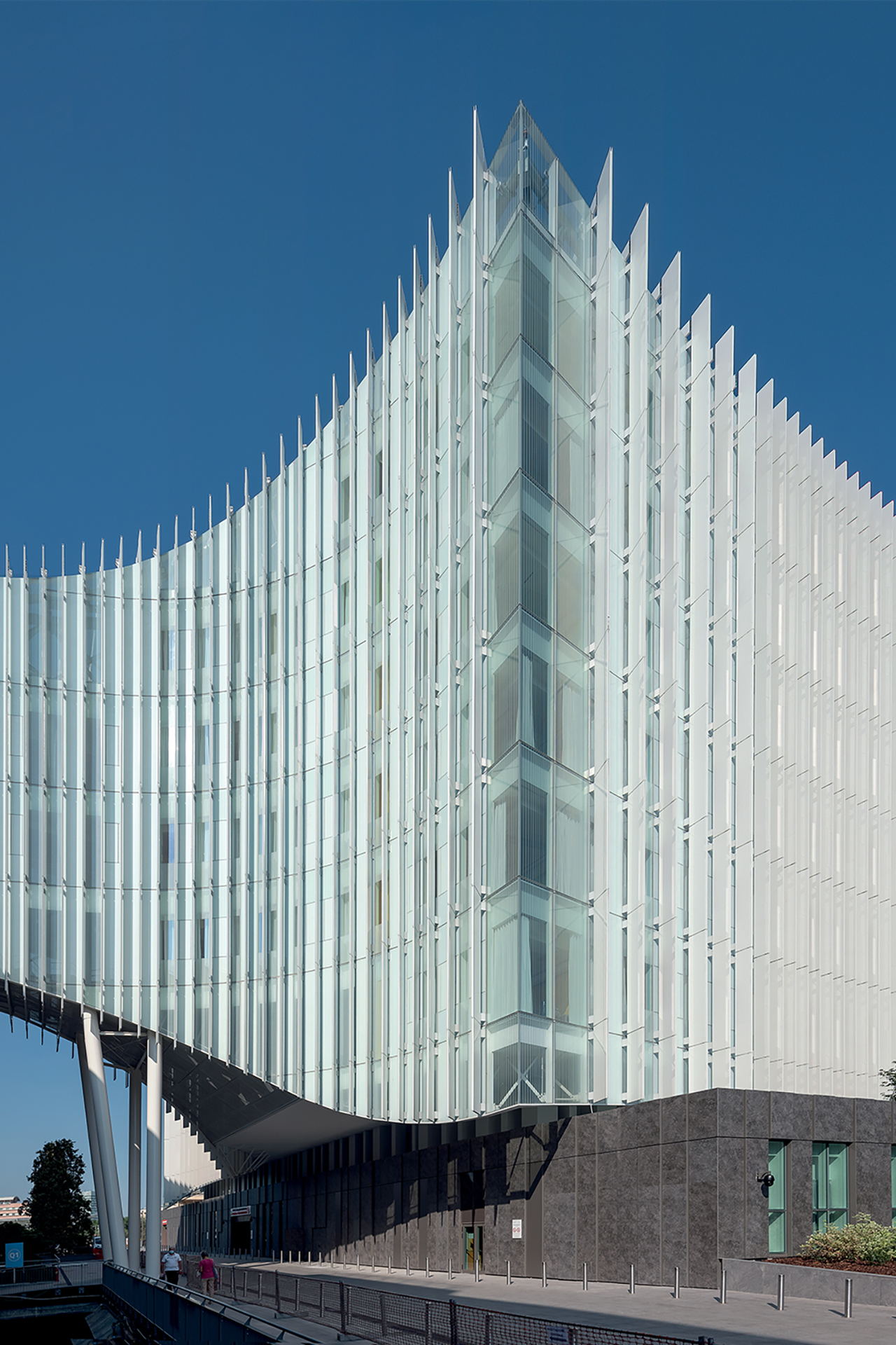 Ungewöhnlich transparent gestalteten Mario Cucinella Architects das Zentrum für Chirurgie und Notfallmedizin des Krankenhauses IRCCS San Raffaele in Mailand. Für Verschattung sorgen Vertikallamellen aus großformatigen Keramikelementen, die nebenbei auch die Umgebungsluft reinigen. Der zehngeschossige Neubau beherbergt 284 Patientenbetten in den Obergeschossen, das landesweit größte Notfallzentrum im Erdgeschoss sowie 20 Operationssäle im Untergeschoss.