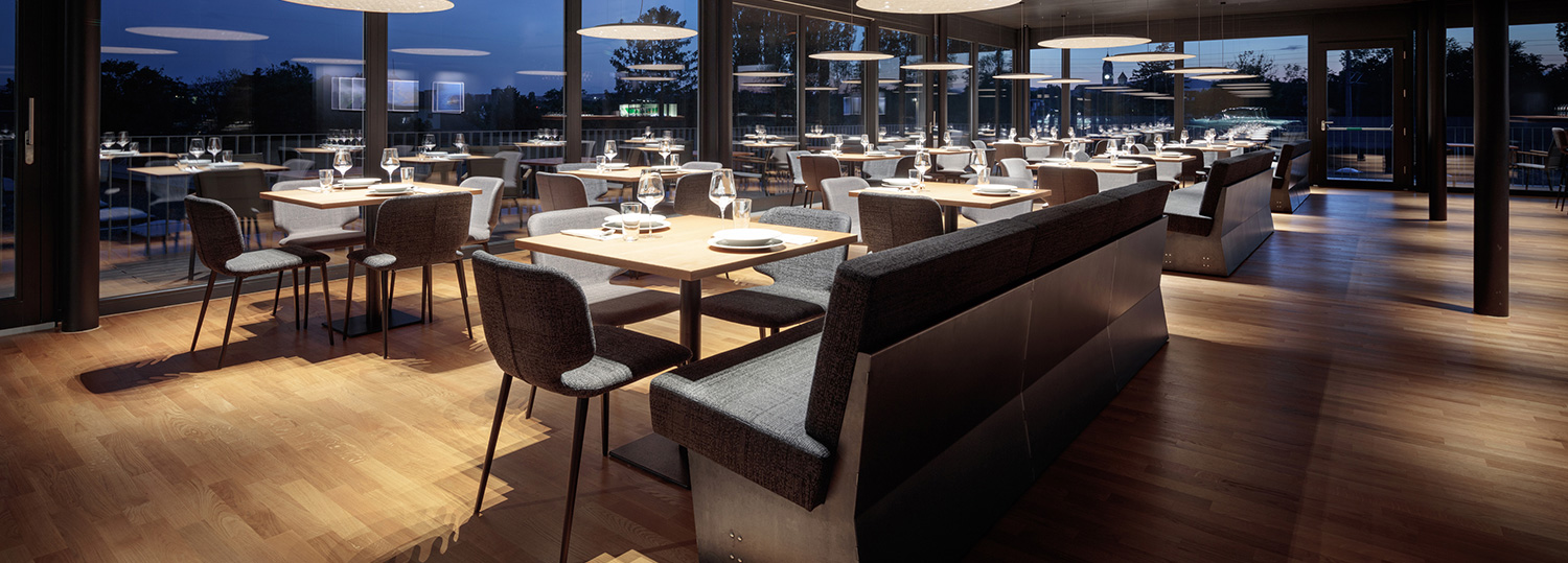 Über den Tischen pendeln die filigranen Lighting Pads, die mit ihren speziellen LED-Linsen als blendfreie Lichtquelle dienen. Zudem sorgen die Pads als geprüfte Schallabsorber mit ihrer haptisch angenehmen Vliesoberfläche für eine optimierte Raumakustik. Die dreh- und schwenkbaren Deckenstrahler der Nimbus Q Four Tt Track Serie setzen die Bar in Szene. Alle eingesetzten Nimbus-Leuchten im V8cht eint das Konzept des Invisible Light. Das heißt, dass die Lichtquelle für das Auge nahezu unsichtbar bleibt und das Licht lediglich die auftreffenden Flächen hell erstrahlen lässt. Die Q Four Deckenleuchten zeichnen sich über ihre Entblendung und ihr präzises, fokussiertes Lichtbild aus. Die minimalistischen Lighting Pads sind zugleich effiziente Schallabsorber und Pendelleuchten mit brillanter Lichtwirkung. Die Aufbauleuchten Q One passen formal zur Q Four Familie und lenken mit ihrem Freiform-Reflektor das Licht zum Beispiel gezielt auf Kunstwerke, wie die Wandbilder im V8cht.
