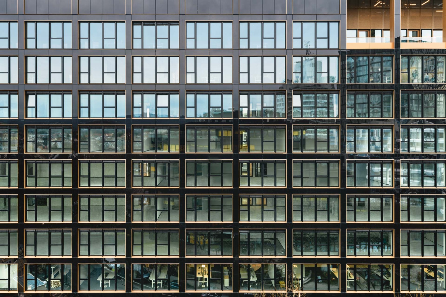 Die bronzefarbenen Einfassungen der Fenster bilden einen dezenten Kontrast zum annähernd schwarzen Farbton der Fassadenelemente. © Stefan Schilling