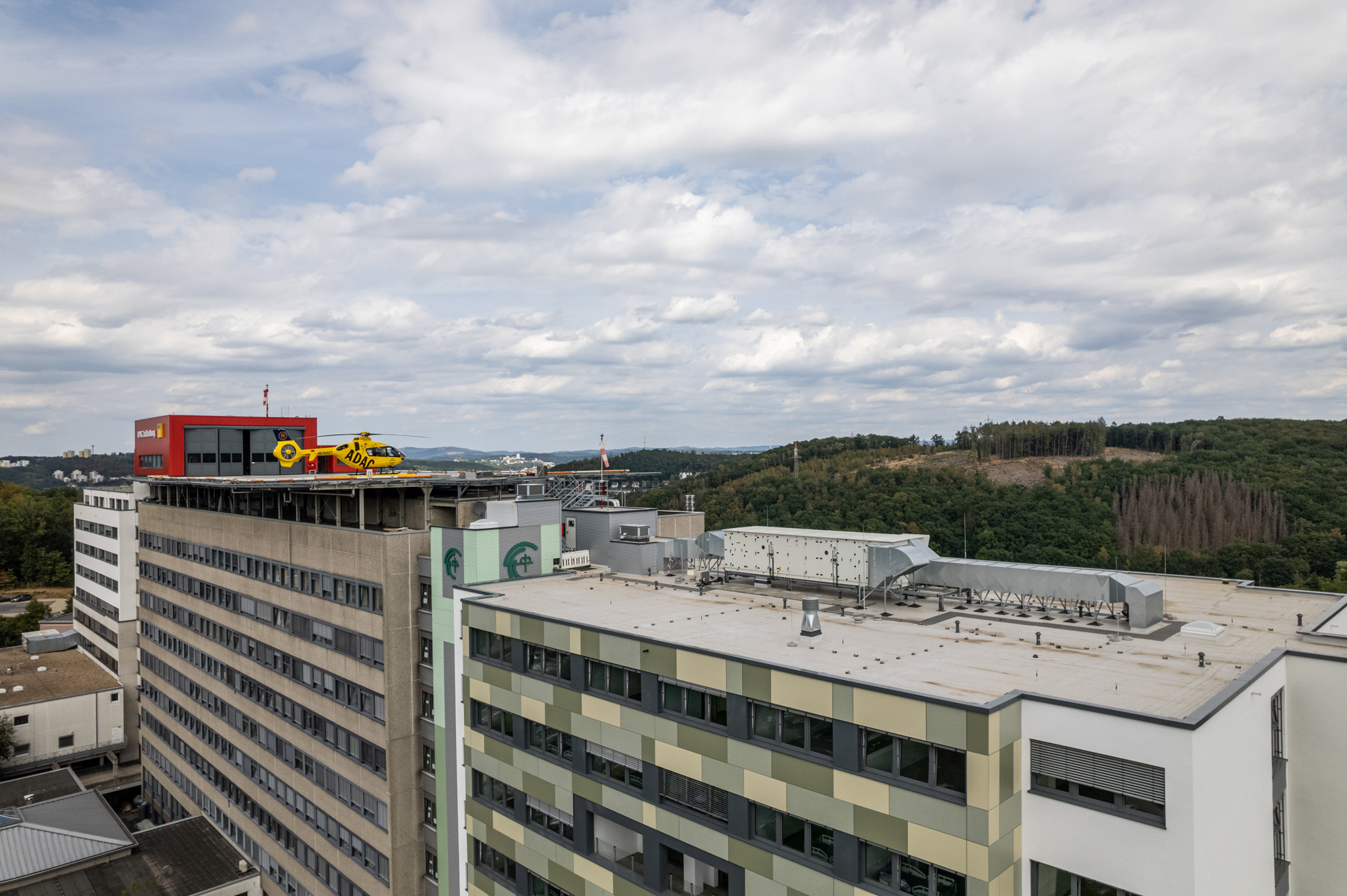Modul- und Massivbauweise wurden kombiniert, um das zwölfgeschossige Gebäude statisch und brandschutztechnisch den Anforderungen entsprechend wirtschaftlich und schnell errichten zu können. Da der Anbau teils in einen Hang integriert ist, liegt der Haupteingang im Erdgeschoss von unten betrachtet in der vierten Etage. Der neue 12-Geschosser bietet Platz für ein umfangreiches Raumprogramm, darunter fünf Bettenstationen für unterschiedliche Fachdisziplinen.