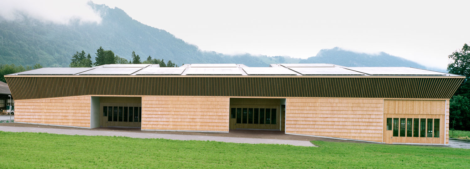 Ganz ohne Metalle, Klebstoffe oder andere chemische Zusätze entstand ein unbehandelter Holzbau dessen Verbindungen lediglich über Holzdübel erfolgen. Das Unternehmen, das bereits 1977 als Schreinerei startete, brauchte mehr Raum für die Herstellung eines eigenen neuen Holzsystems: Das Ergebnis ist ein nachhaltiges Vollholzsystem, welches ausnahmslos aus Tannen- und Fichtenhölzern der Region besteht. Im Vordergrund des Entwurfs stand somit vor allem der geringe CO²-Verbrauch durch kurze Transportwege, die Entscheidung zu Steinwolle als Dämmmaterial und die Wahl des Holzes als nachwachsender Rohstoff. Während Photovoltaikanlagen auf dem Dach die Halle mit Strom versorgen, erfolgt die Wärmeerzeugung durch eine Holzschnitzelanlage, die Wärmeabgabe über eine thermisch aktivierte Bodenplatte.