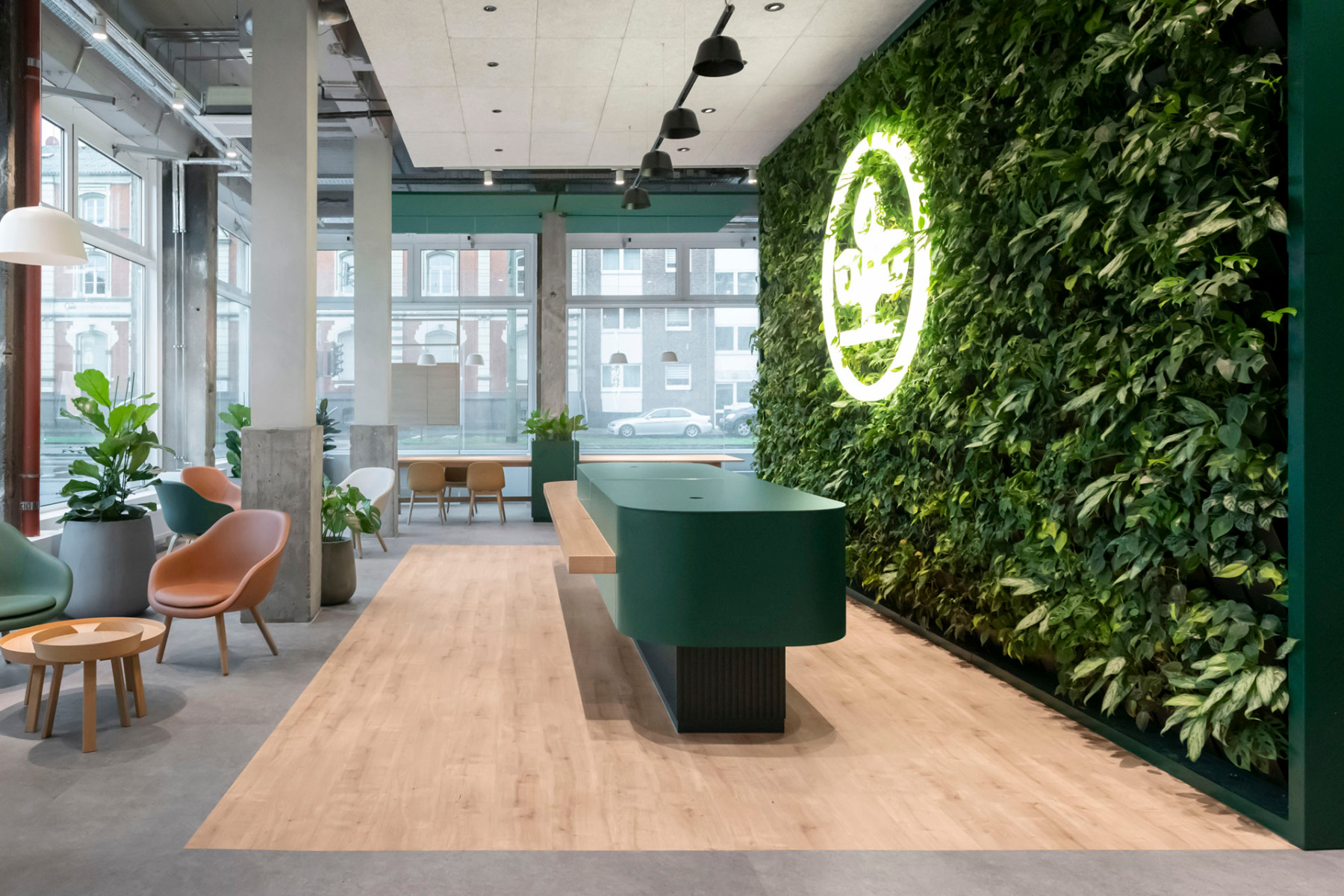 Die Planenden entschieden sich für den Purline Bioboden wineo 1500 wood L Canyon Oak Sand, um eine behagliche Atmosphäre zu schaffen. Dieser wird durch die Rollenware wineo 1500 chip Racing Green ergänzt, die perfekt mit dem charakteristischen AOK-Grün harmoniert. Purline, ein nachhaltiger, dauerelastischer Polyurethan-Boden, ersetzt petrochemische Polyole durch natürliche Öle und gibt keine schädlichen Stoffe ab.