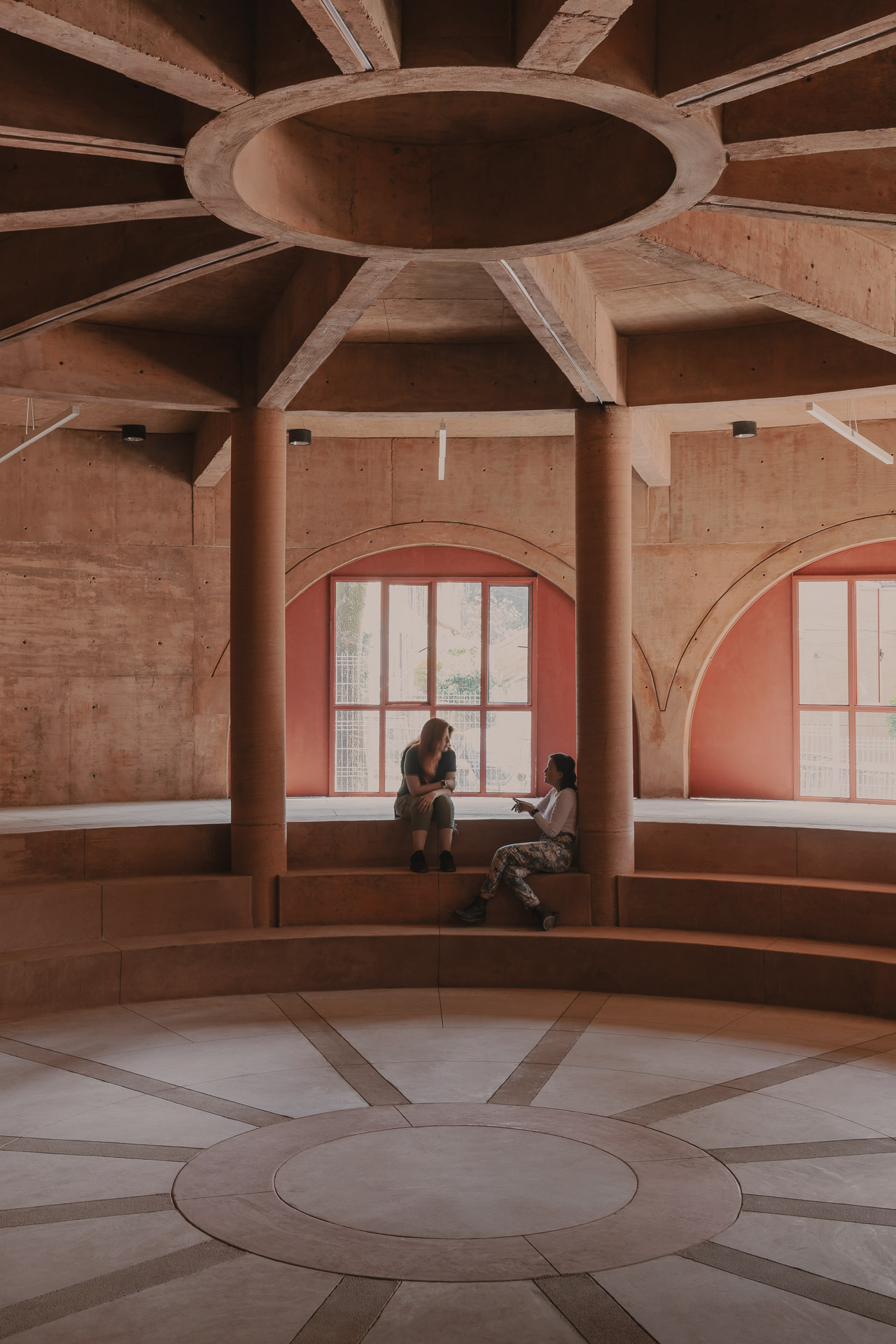 Das Gelände ist von zahlreichen Eukalyptus-, Kiefer- und Clorínbäumen umgeben. Ein zentraler Ansatz des Entwurfs war es daher, so viel vorhandene Vegetation wie möglich zu erhalten. Die Position der Bäume war für die Platzierung der Mehrzweckhalle und der terrassenartig angelegten Plattformen von maßgeblicher Bedeutung. Durch die runde Form des Gebäudes und seine sorgfältig abgestimmte Anordnung konnte ein zusammenhängender, durchgehender Freiraum entstehen. Um den Herausforderungen der Geländeform entgegenzuwirken und die neue Parkanlage zu schützen, hat das Architekturteam zwei Absorptionsbrunnen installiert, die Regenwasser aufnehmen und ableiten.