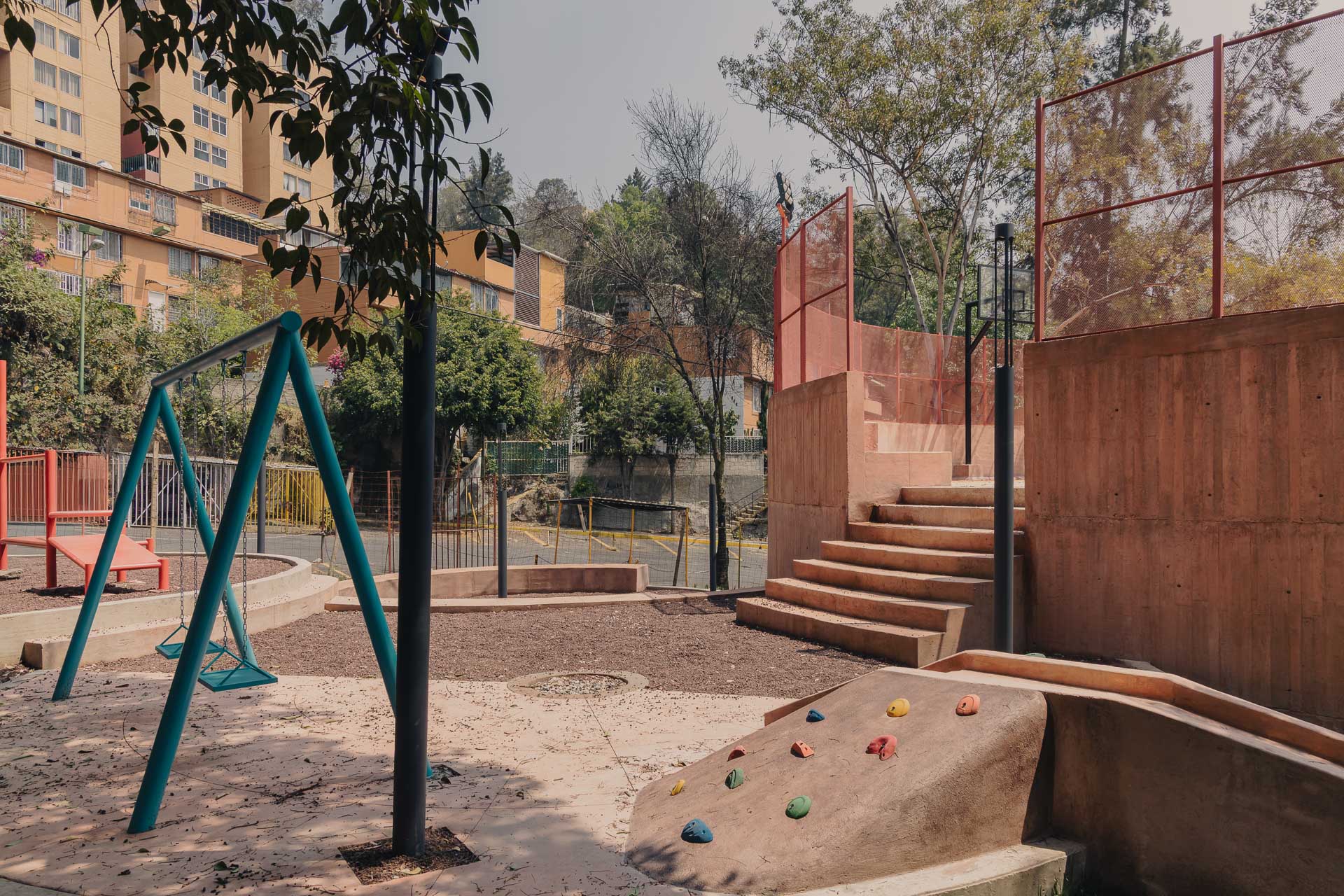 Auf einem dreieckigen Restgrundstück am südlichen Rand der Wohnanlage Infonavit Santa Fe im Westen von Mexiko-Stadt, hat das spanische Architekturbüro AmasA Estudio einem vernachlässigten Ort neues Leben eingehaucht. Durch den baulichen Verfall nutzte die Nachbarschaft das Gelände kaum noch und es galt zunehmend als unsicher. Anstatt die Fläche weiterhin als brachliegende Infrastruktur zu akzeptieren, beauftragte Infonavit eine umfassende Erneuerung des Areals. Entstanden sind eine neue Mehrzweckhalle, Kinderspielplätze, Outdoor-Fitnessbereiche und ein restaurierter Sportplatz. Heute fungiert das Areal als städtebaulicher Knotenpunkt – ein Ort, der aktive Nutzung, Gemeinschaft und Sicherheit miteinander verbindet.