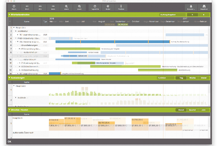 Der optimale Einsatz der Mitarbeiter ist die beste Voraussetzung für einen erfolgreichen Auftrag. »Pro simulation« von Projekt Pro ist eine neue Komponente der »Software Pro enterprise« und plant grafisch den Einsatz der Mitarbeiter. Es lassen sich so verschiedene Szenarien simulieren und das Für und Wider fiktiver Konstellationen, Auftragssituationen und Personalbedarfe abwägen. Zudem prognostiziert »Pro simulation« Umsätze und Kosten.