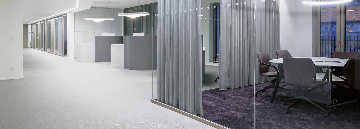 Für eine konzentrationsfördernde Arbeitsumgebung sorgt das raumhohe, rahmenlose Ganzglassystem 3400 von Strähle. Es trennt die offenen Kommunikationszonen von den Büroeinheiten und bildet Rückzugsorte in verschiedenen Varianten. Wo Diskretion gewünscht ist, dienen Vorhänge als Sichtschutz. Das eigens für pureSilent entwickelte Farbkonzept aus warmen Eloxal-, Grau-, Blau-, Aubergine- und Weißtönen unterstreicht die ruhige, elegante Atmosphäre. Zur Unterstützung des Farbkonzepts sind die Aluminiumprofile von System 3400 in E6 C31 eloxiert ausgeführt. Als Spezialist für Schallschutz und Akustik war Strähle an der Entwicklung des neuen Raumkonzeptes beteiligt und liefert für die neuen Standorte Trennwand und Raum-in-Raum-Systeme, die den Anforderungen funktional und formal gerecht werden.