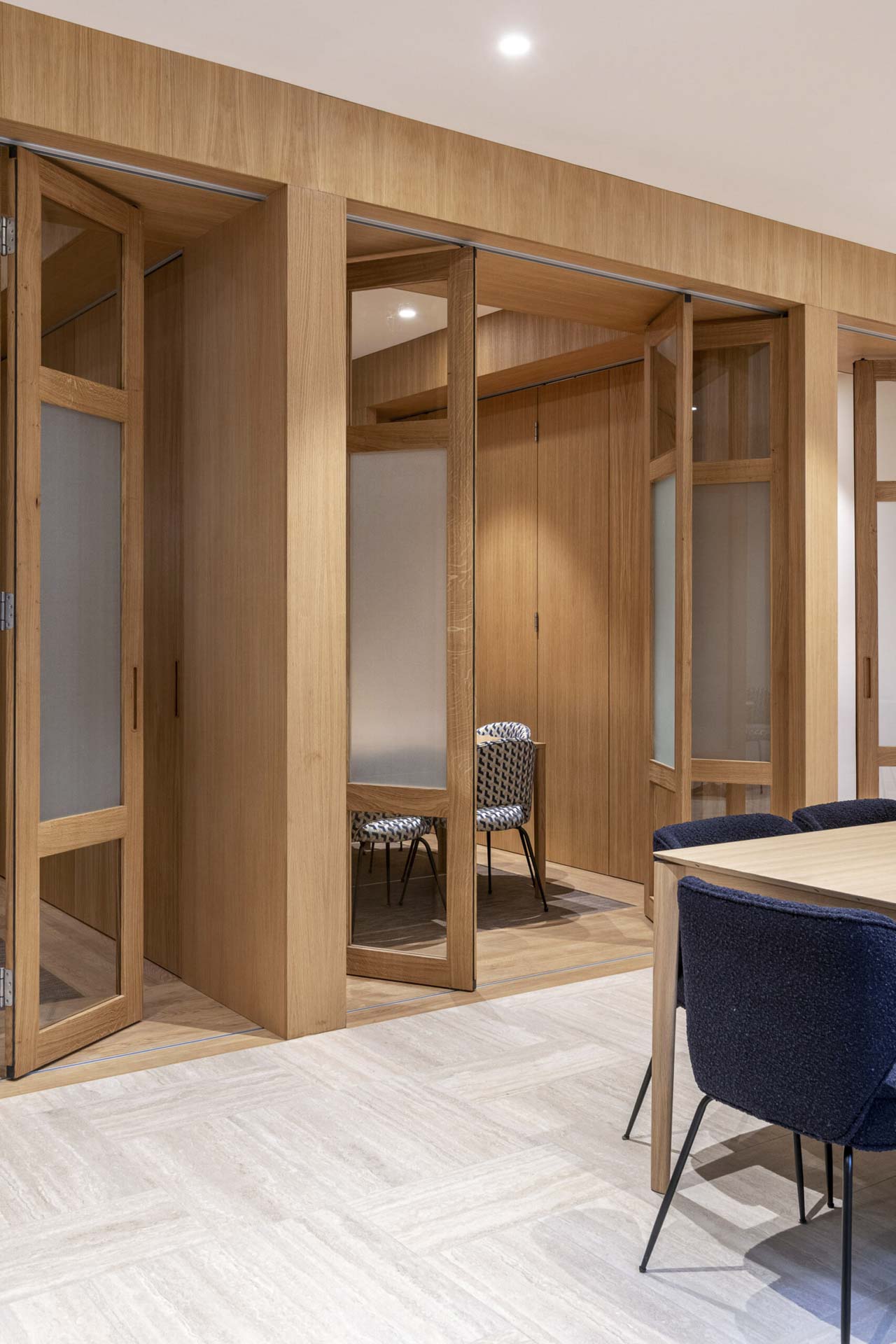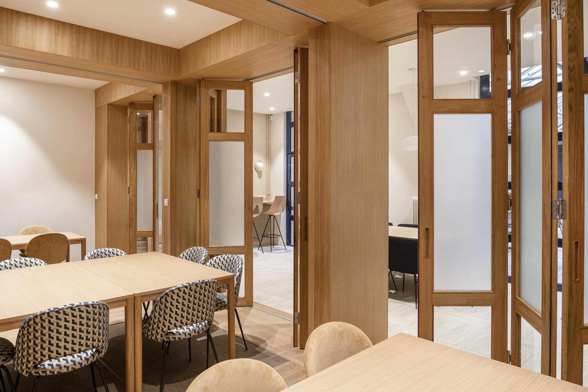 Im Zuge der Modernisierung eines Bürogebäudes in der Rue Vauban in Bordeaux wurde das Erdgeschoss neu organisiert. Ziel war eine flexibel nutzbare Raumstruktur für Pausen, Meetings und Veranstaltungen. Innenarchitektin Constance Gardès und Schreiner Guillaume Boidin setzten dabei auf Falt-Schiebewände von Hawa. Bewegliche Holz- und Glaselemente ermöglichen variable Raumteilungen, ohne Tageslicht oder Raumqualität einzuschränken.