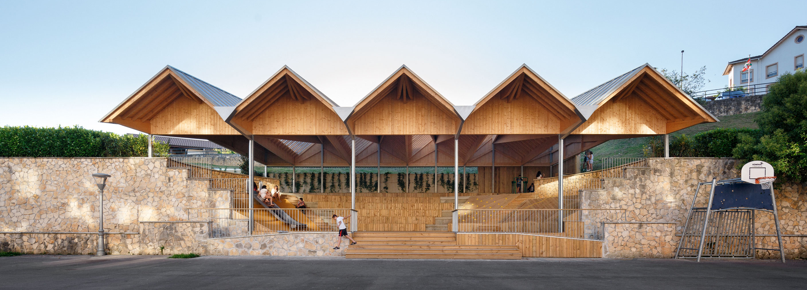 The design consists primarily of an amphitheatre encompassed on both sides by a wall of natural stone; a roof with large folds shelters this area from the weather. The predominant material is wood. Both the roof construction and the built-ins for various activities are made of light-coloured wood.