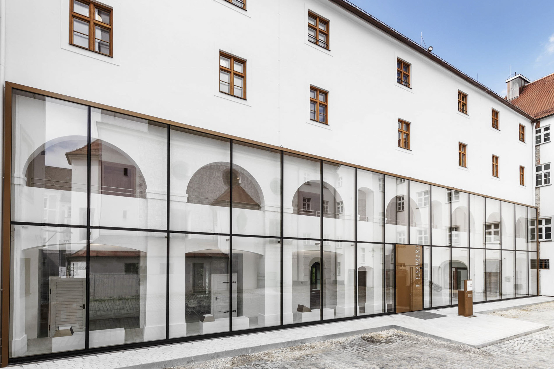 Wohl die deutlichste Veränderung gab es an der Hoffassade des Westflügels. Hier öffneten die Planer die alten Arkadenbögen und blendeten ihnen eine zweigeschossige Glasfassade vor. Das schafft zum einen ein repräsentatives Entree für das Finanzamt und sein Servicezentrum. Zum anderen können Besucher so schon aus dem Hof einen Blick auf die Sgraffito-Verzierungen in den Innenräumen werfen.