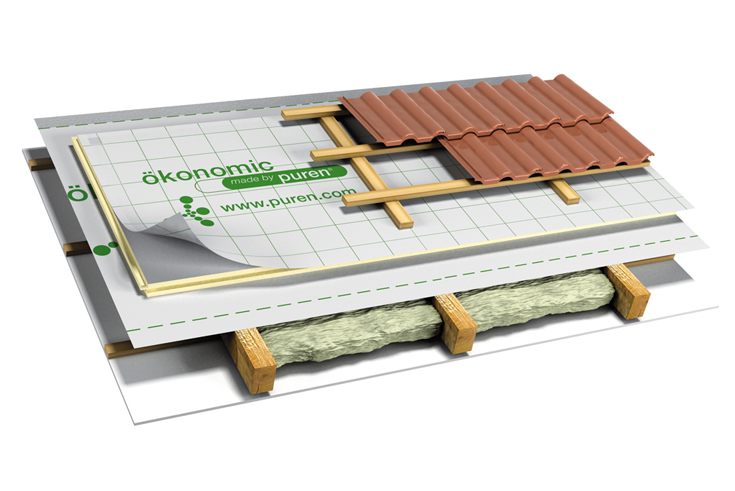 Speziell für Dachsanierungen hat puren das Aufsparren-Dämmsystem ökonomic entwickelt. Es besteht aus einem (je nach erforderlichem U-Wert) 50 bis 80 mm starken PU-Dämmelement der Wärmeleitfähigkeitsstufen 027 und 028 mit aufkaschierter und überlappender, beidseitig selbstklebender Unterdachbahn.