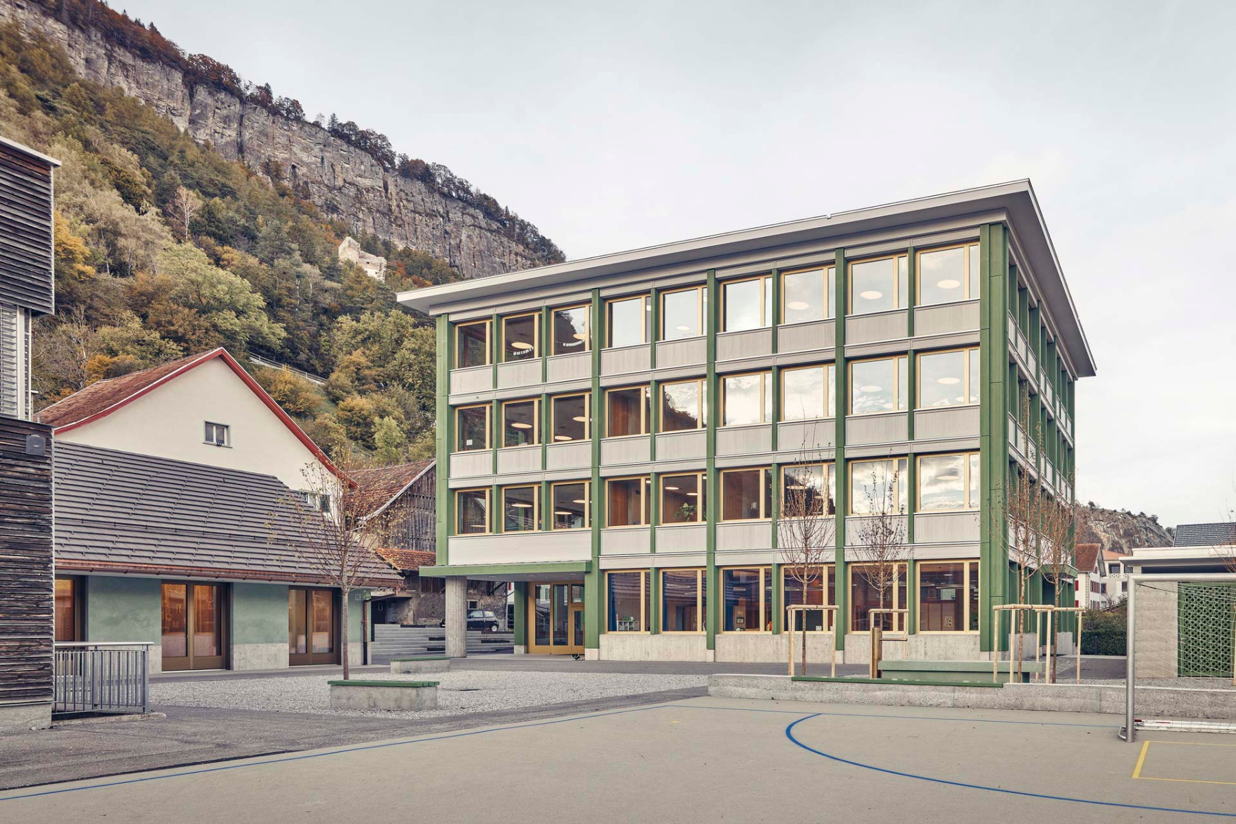 Das Schulareal liegt am Rand des Dorfzentrums. Der Entwurf nimmt Bezug auf die lokale Bebauung. © Lukas Murer Fotoarbeiten