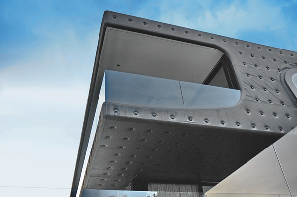 Das perfekte Fassadenmaterial also, dachten sich die Planer von Gasser Fassadentechnik und spielten mit den gestalterisch assoziativen Möglichkeiten des Materials. Ob das klassische Lastwagenplanen-Design oder eher die schwarze Gummiplane mit sichtbaren Befestigungselementen: Der Gestaltung sind keine Grenzen gesetzt. Der EPDM-Kautschuk wird in einer Stärke von 1,3 mm als Rollenware hergestellt und verlegt. Die Planen können bis zu 2.000 m lang sein und ermöglichen fugenlose, homogene Oberflächen. Die Bahnen werden in der Werkhalle vorkonfektioniert und dann vor Ort montiert. Um Oberflächen mit Polstereffekt zu realisieren, werden die verschweißten Kautschuk-Bahnen mit Klemmhaltern am Baukörper bzw. der Unterkonstruktion fixiert.