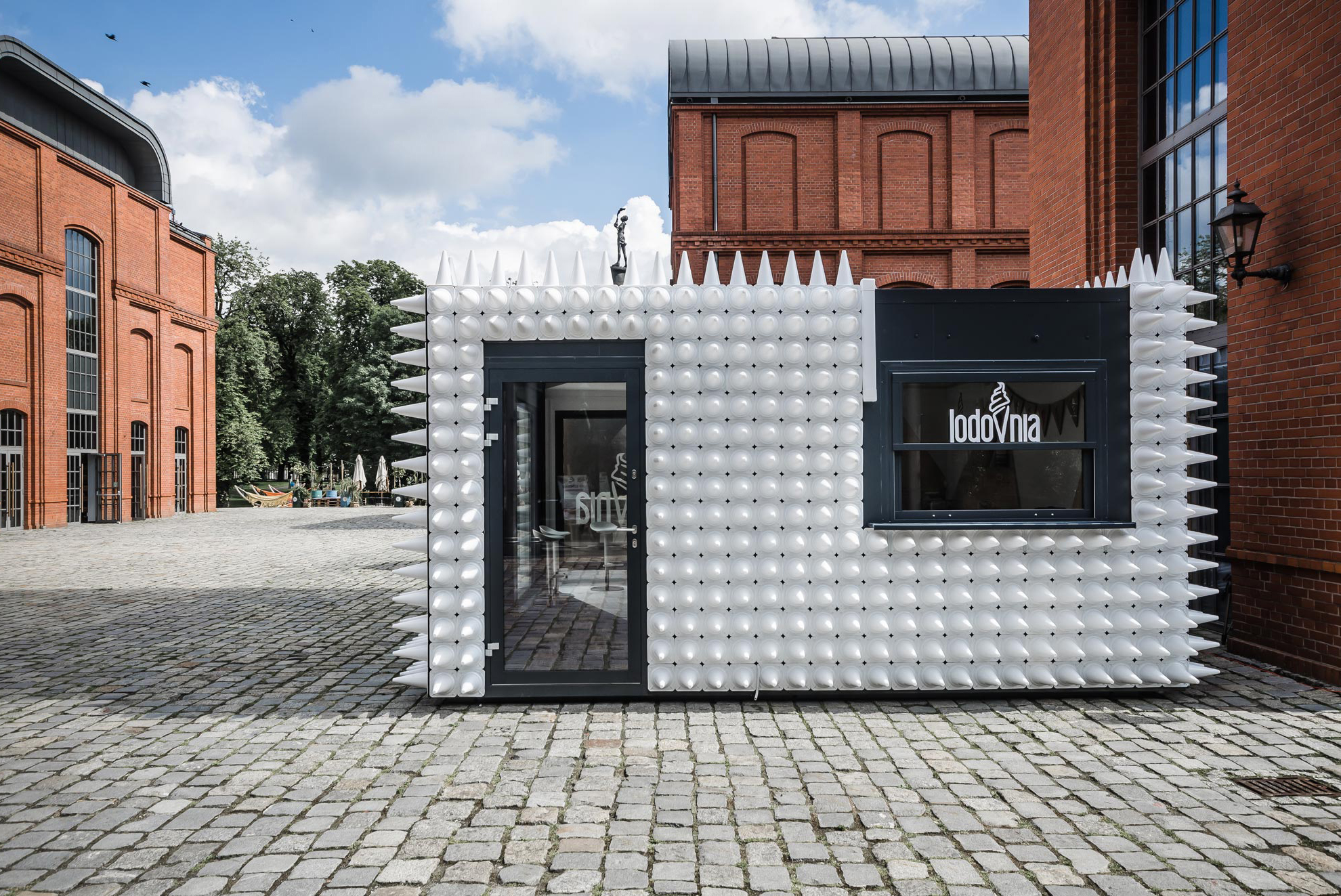 Die neue mobile Eisdiele Lodovnia ist in der ehemaligen Brauerei Stary Browar vorzufinden. Der Kiosk im Innenhof des heutigen Einkaufszentrums zieht alle Blicke auf sich, da die einzigartige Fassade des kleinen Bauwerks wie ein Kunstwerk behandelt wird. Die dunklen Wände des 35 m2 großen Kiosks überziehen die Architekten von mode:lina mit etwa tausend weißen Verkehrskegeln aus Plastik. Ihre konusartige Form steht für das eigentliche Produkt, welches im Kiosk zu kaufen gibt – das Eis in einer Waffel.