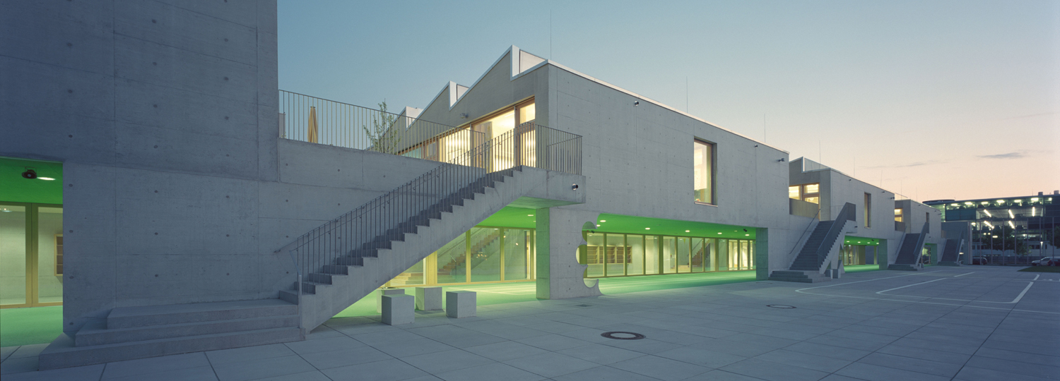Über einer leuchtend grünen Laufbahn kragt das Obergeschoss rund 8,50 m aus, wodurch ein geschützter Pausen- bzw. Sportbereich entsteht. Durch die Überdachung kann der Sprintbahn fast ganzjährig für den Sportunterricht genutzt werden.