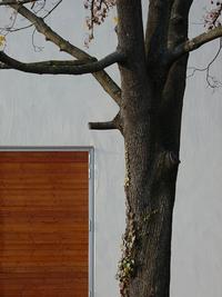 Fassade mit Polyurethanspritzputz und Acrylglasscheibe