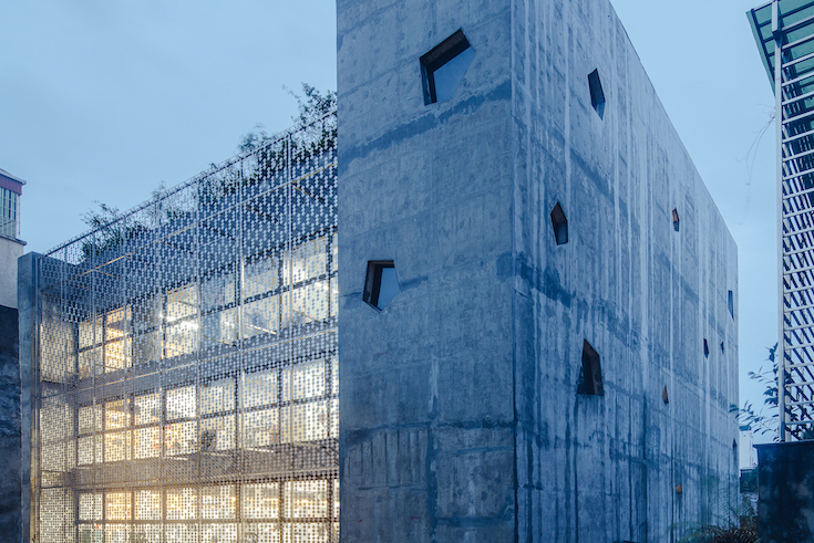 While the entrance seamlessly branches off from the footpath, porous elements - such as the mesh on the entryway side and the planted latticework on the rear of the building - serve as passive sunshades. The tall open shaft on the back side of the office complex enhances natural ventilation.