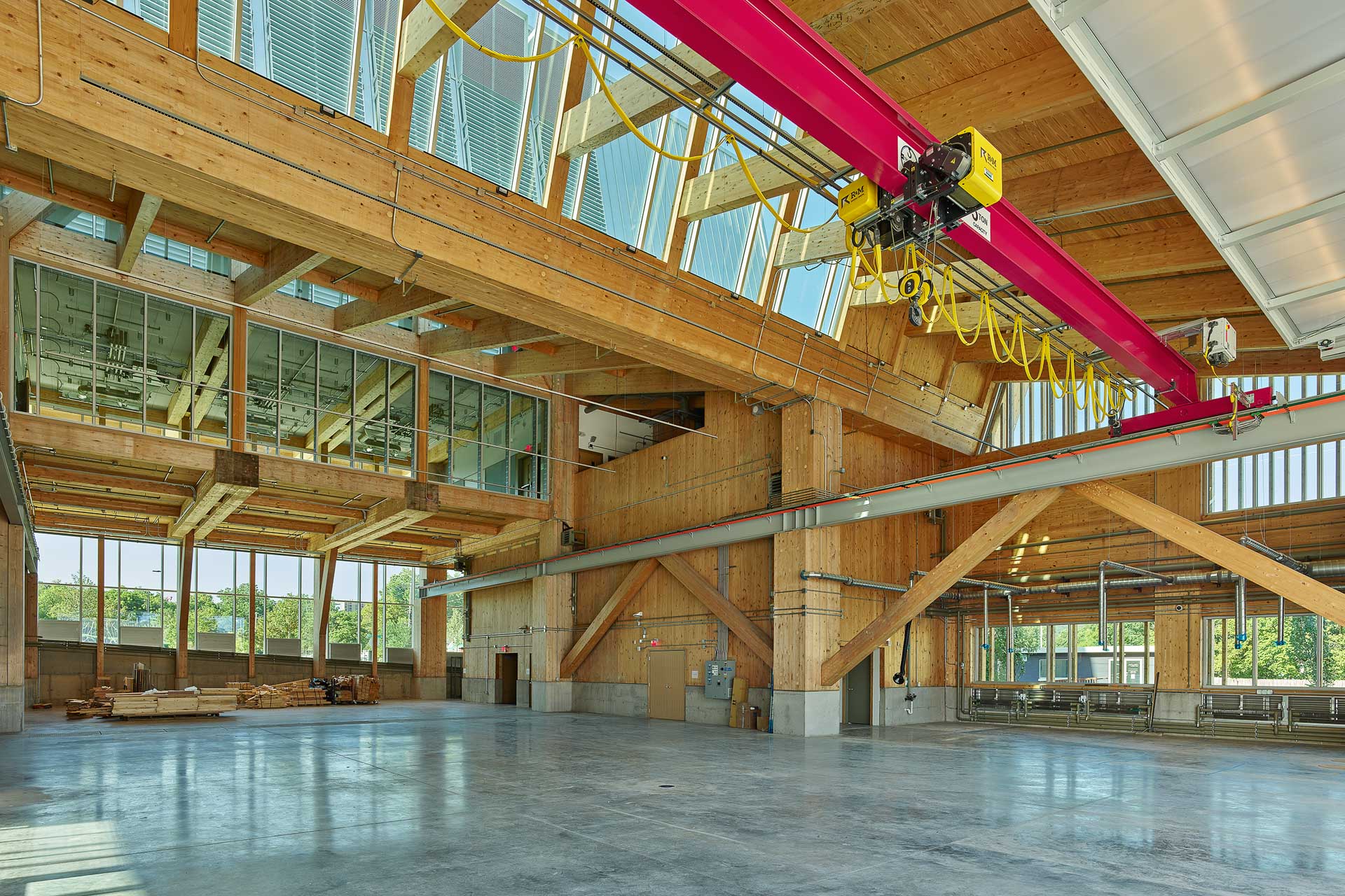 Dreh- und Angelpunkt des Raumprogramms ist die rund 1000 m2 große Werkstatt im Zentrum des Erdgeschosses. Der stützenfreie Raum nimmt die gesamte Gebäudelänge ein. Auf der Südseite können durch ein großes Schwingtor aus Polycarbonatstegplatten selbst größte Bauteile angeliefert werden. Im Norden erlaubt eine Glasfront Einblicke von der Straße aus. Die Stützen und Träger, die den Raum begrenzen, wirken auf den ersten Blick überdimensioniert – doch sie müssen nicht nur das Dach und die Obergeschosse tragen, sondern auch einen Portalkran, mit dem die Werkstücke in der Halle bewegt werden können.