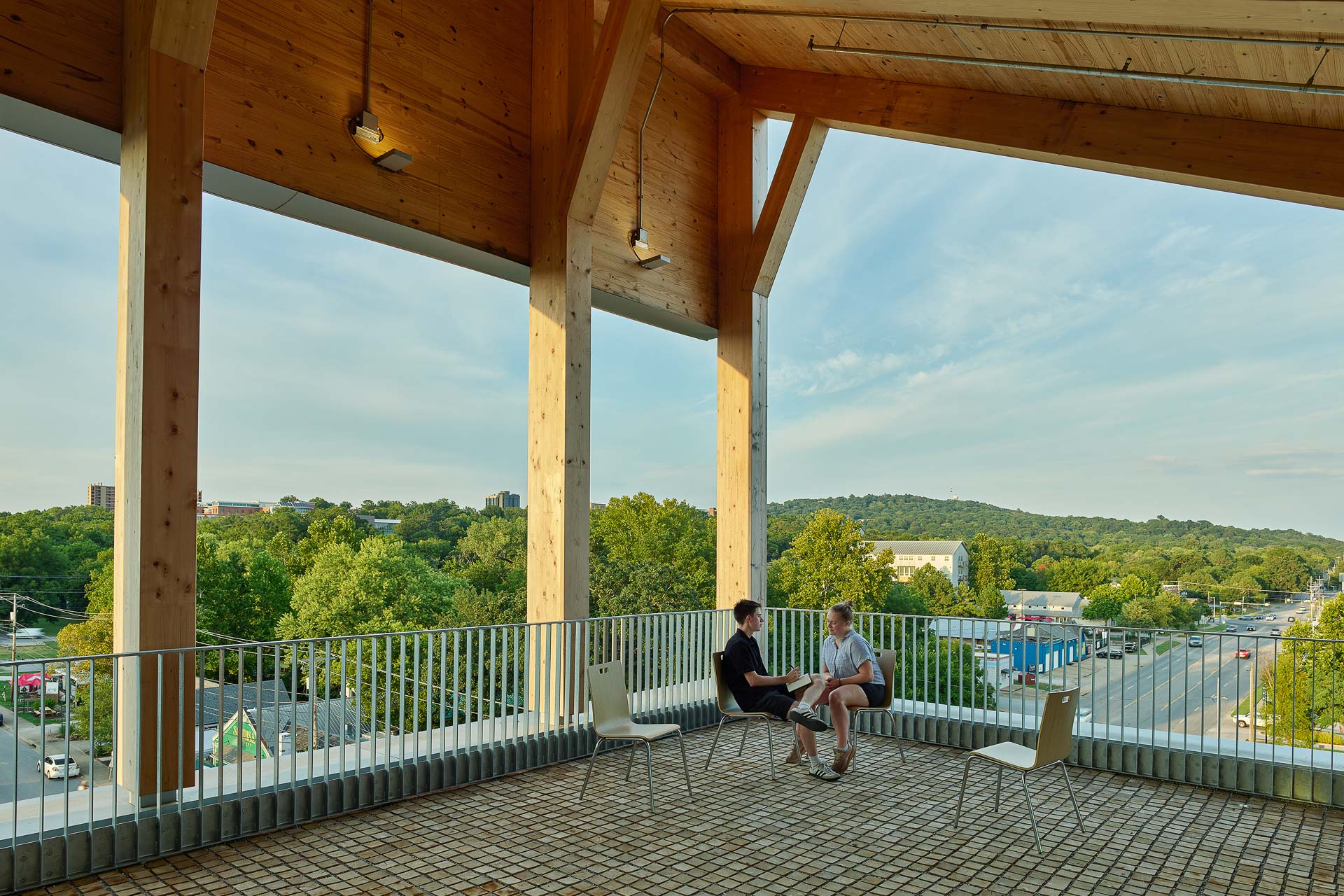 Der US-Bundesstaat Arkansas entspricht so gar nicht dem landläufigen Bild des Mittleren Westens mit seinen endlosen Prärien und Maisfeldern: Bis auf 800 m Meereshöhe steigen die Mittelgebirge an, auf 60 % seiner Fläche wachsen Eichen-, Kiefern- und Hickorywälder. Eigentlich eine Traumregion für den Holzbau. Die University of Arkansas in Fayetteville, einer 100 000-Einwohner-Stadt ganz im Nordwesten des Bundesstaats, setzt schon länger darauf, diesen natürlichen Schatz zu heben und in die Lehre einfließen zu lassen. Der treibende Motor ist Peter MacKeith, seit 2014 Dekan der Architektur- und Designfakultät, der sein Handwerk unter anderem im Holzbau-Mekka Finnland lernte.