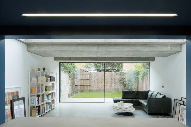 Bureau de Change sind inzwischen geübt in solchen Anbauten an Wohnhäuser. Bei ihren Entwürfen steht meist der Kontrast zum Bestand im Vordergrund. Der Bestand ist in diesem Fall ein typisches Londoner Reihenhaus mit brauner Ziegelfassade. Im Erdgeschoss wird der Wohnraum in den Garten hinaus erweitert.