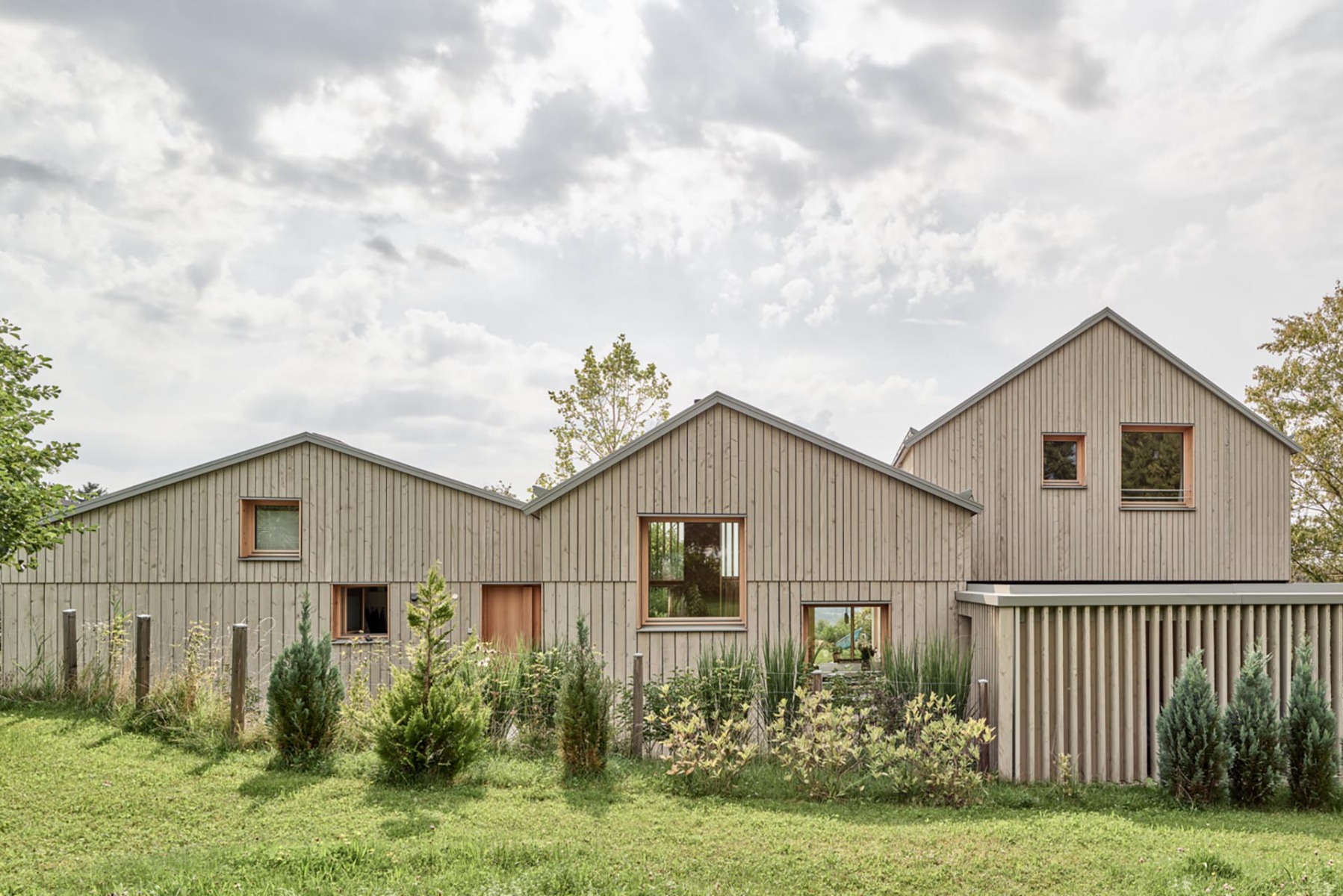 In der Nähe von Steyr an der Donau hat das Architekturbüro Mia2 ein dreiteiliges Wohn-Ensemble geschaffen, das allen Mitgliedern einer Patchworkfamilie passende Rückzugsmöglichkeiten bietet. Das Haus für fünf Personen steht auf einem zuvor unbebauten Grundstück in St. Ulrich, einem dörflichen Vorort der oberösterreichischen 40 000-Einwohner-Stadt.