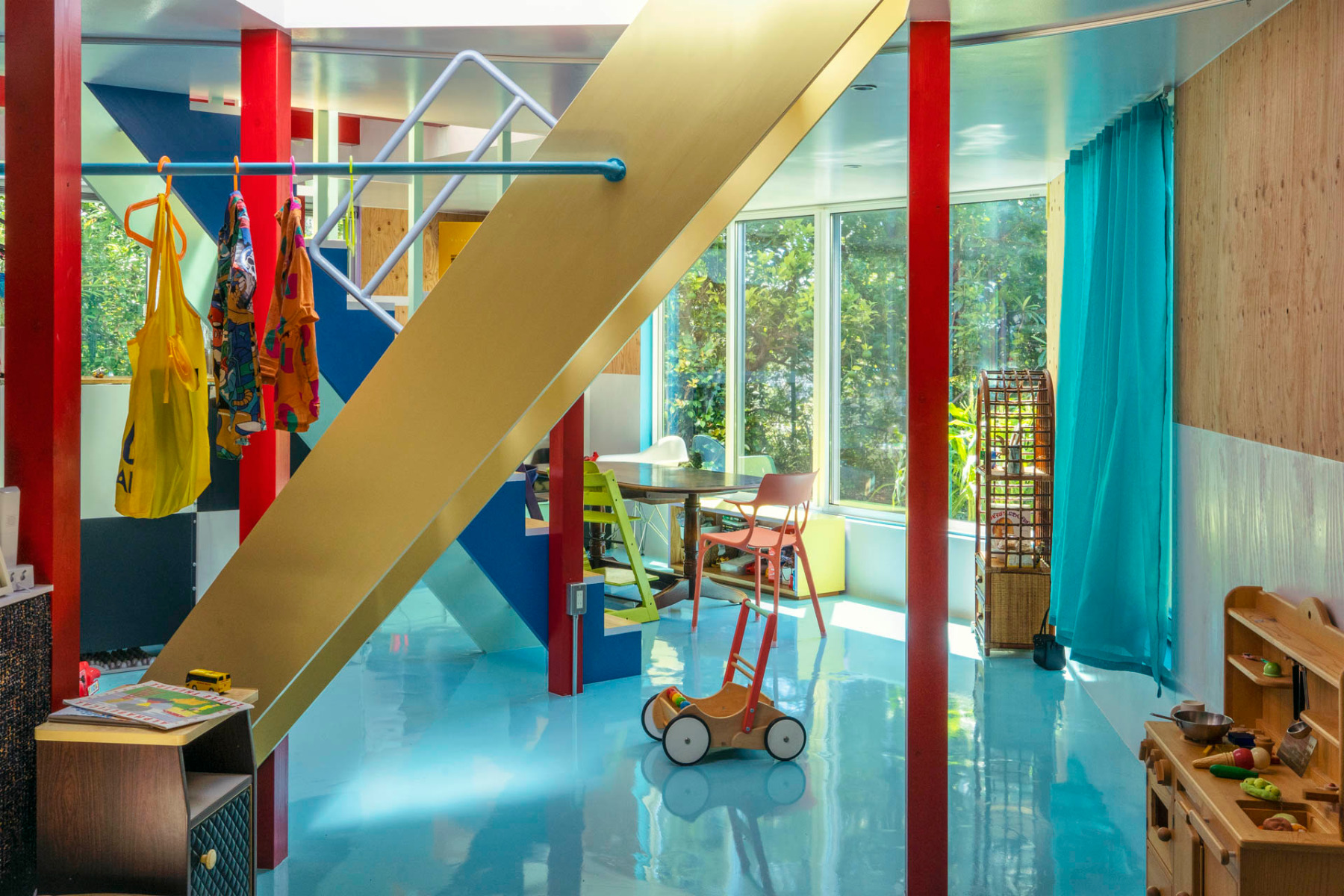 Die gestalterische Ausformulierung der Räume ist genauso vielschichtig wie das räumliche Konzept: So sind etwa die Wangen, Stufen und Geländer der Treppen unter anderem in Gelb-, Violett-, Grün- und Blautönen gestrichen. Rote, gelbe und türkisfarbene Vorhänge sorgen für zusätzliche Nuancen, während der mit einer wasserdichten Beschichtung gestrichene Betonboden im Erdgeschoss als hellblau glänzende Fläche darunter hindurchfließt.