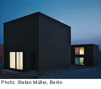 In Anlehnung an die Ideen des Bauhauses entsteht derzeit auf dem ehemaligen Kasernengelände am Stadtrand von Weimar ein neues Wohnquartier. Diener & Diener, Adolf Krischanitz und Luigi Snozzi sind für die städtebauliche Planung und den Bebauungsplan verantwortlich. Die Grundstücke sind nach einem strengen Modulsystem parzelliert, einfache Volumina mit flachen Dächern obligatorgisch. Auf einer dieser Parzellen von 7,5 m Breite stehen sich die zwei schwarzen Kuben des Wohnhauses und des Ateliers gegenüber. Unter dem glatten gefärbten Putz verbergen sich 36 cm starke Leichthochlochziegel als einschaliges Mauerwerk. In beiden Gebäuden verbindet eine einläufige Treppe die Nutzungen. Im Inneren sind nahezu alle Räume weiß verputzt und mit einem hellen Parkettboden ausgestattet.